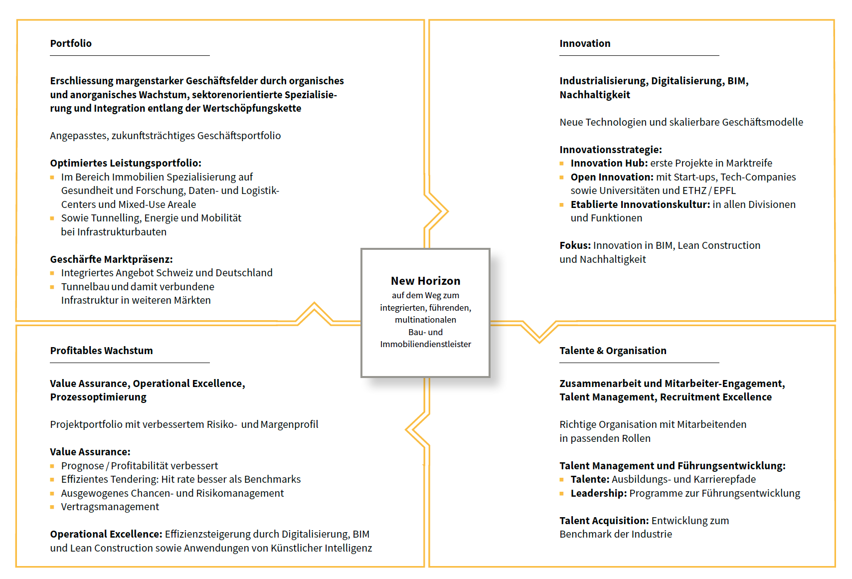 Um langfristig für die Kunden, Mitarbeitenden und Aktionäre Wert zu schaffen, muss Implenia profitabel wachsen, Marktanteile gewinnen und die Margen steigern. Dazu konzentriert sich Implenia auf Geschäfte mit höherer Profitabilität und steigert Marktanteile, beispielsweise indem einzelne Geschäftsfelder ausgebaut und andere transformiert werden. Zudem optimiert die Gruppe die internen Prozesse laufend bezüglich Effektivität und Effizienz.