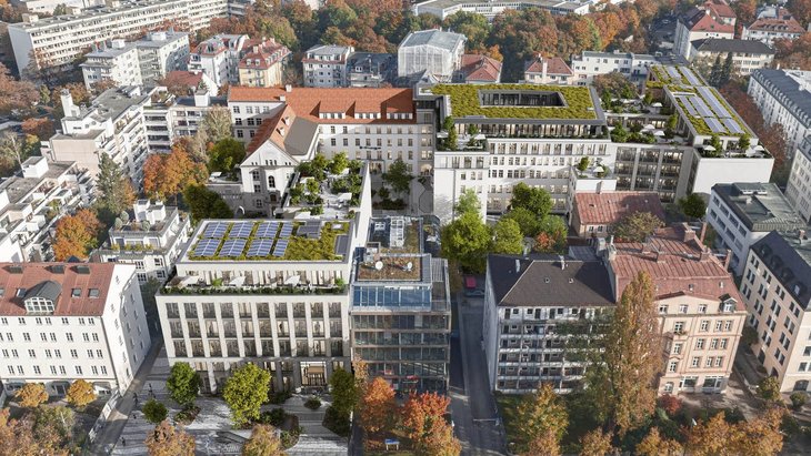 Moderner innerstädtischer Bürostandort als Neubau und neubaugleiche Bestandssanierung: Implenia plant, baut und modernisiert fünf Gebäude im Münchener Bruckmann-Quartier.