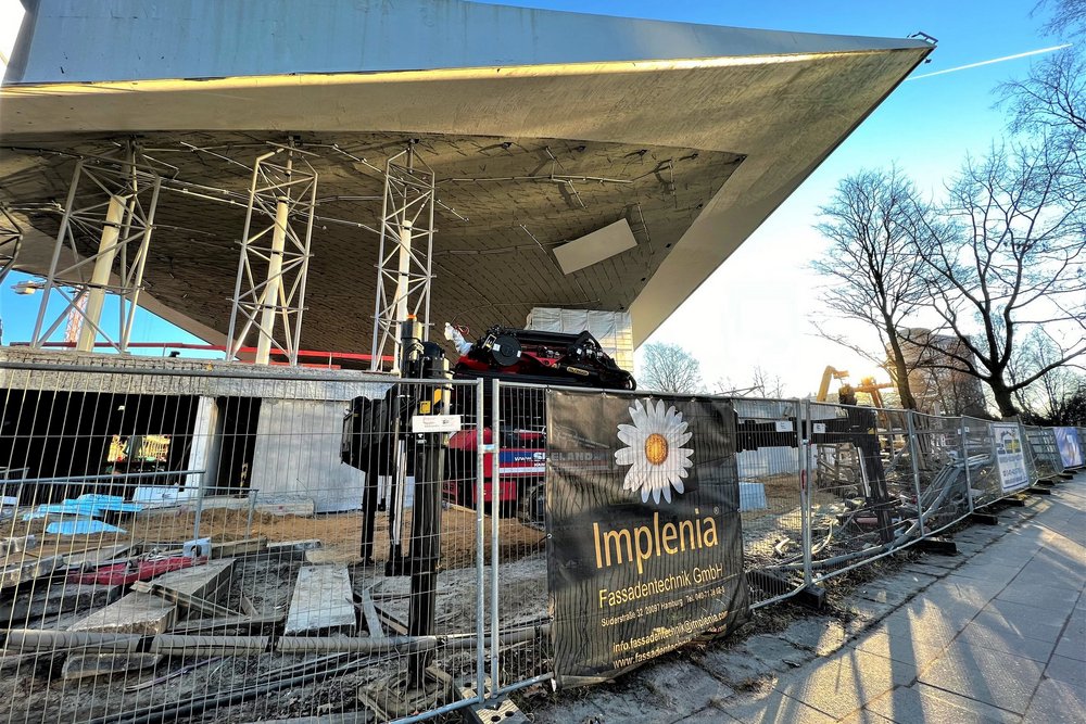 Eine der drei weit auskragenden Spitzen der Dachkonstruktion der Alster-Schwimmhalle– einem Stahlbeton-Schalentragwerk aus hyperbolischen Paraboloiden. Die Konstruktion ist weitgehend freitragend und steht nur auf drei massiven Stützen auf. Aufgrund der Schalentragwirkung kommt die Konstruktion mit einer Betondicke von nur 8 Zentimetern aus. Das Bild zeigt die denkmalgeschützte Dachkonstruktion kurz vor dem Wiedereinbau der Fassadenkonstruktion.