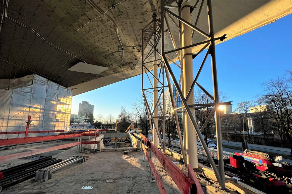 Anfang März 2022 war es soweit: Die sanierten, ebenfalls denkmalgeschützten Fassadenträger wurden wieder eingebaut. Hier wird die erste Fassadenstütze mit dem dafür vorgesehenen Einbauteil in der Betondecke gekoppelt. Aufgrund der starken Auf- und Ab-Bewegungen des Dachtragwerkes sind die Stützen über eine speziell entwickelte verschiebbare Auflagerkonstruktion angeschlossen, die einerseits die Fassade festhält und gleichzeitig eine freie Beweglichkeit der Dachkonstruktion ermöglicht.
