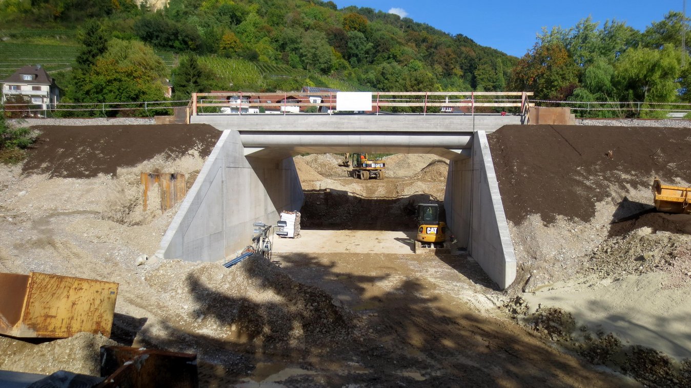 Implenia wurde mit dem Neubau einer Eisenbahnüberführung in Grenzach-Wyhlen beauftragt. Das Bauwerk wurde in einer Herstellbaugrube neben dem Bahndamm hergestellt und nach dem Einbau von Hilfsbrücken unter diese verschoben. Danach wurden die Hilfsbrücken wieder ausgebaut und die vier Flügelwände ergänzt.