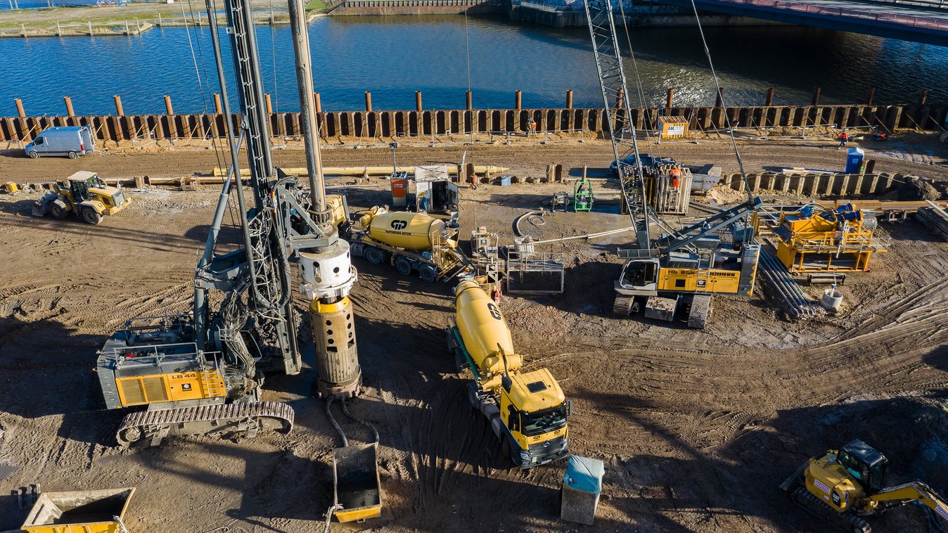 Auf einer Fläche von rund 21.000 m² werden für den Baugrubenverbau 18.000 m² Dichtwände mit eingestellter Spundwand sowie 4.700 m² Schlitzwand und deren mehrlagige Rückverankerung hergestellt. Im Oberhafenkanal sichert eine rückverankerte, eingepresste Spundwand mit Dalben den Rückbau der alten Kaimauer.