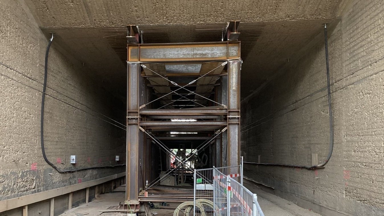Dafür werden vor den Wänden der Stahlbetonrahmenbrücke unter beschränkter Höhe Gründungspfähle gebohrt, die mit einem austeifenden Kopfbalken versehen werden. Dieser Kopfbalken wird im Pilgerschrittverfahren unter die bestehenden Wände verlängert. Die Wände selbst werden in ihrer Dicke um 20cm mit Spritzbeton verstärkt. Diese Verstärkung wird mit Einstabankern mit der Bestandswand verbunden. Damit bildet der Kopfbalken dann die tragende Verbindung zwischen den verstärkten Wänden und den Bohrpfählen.