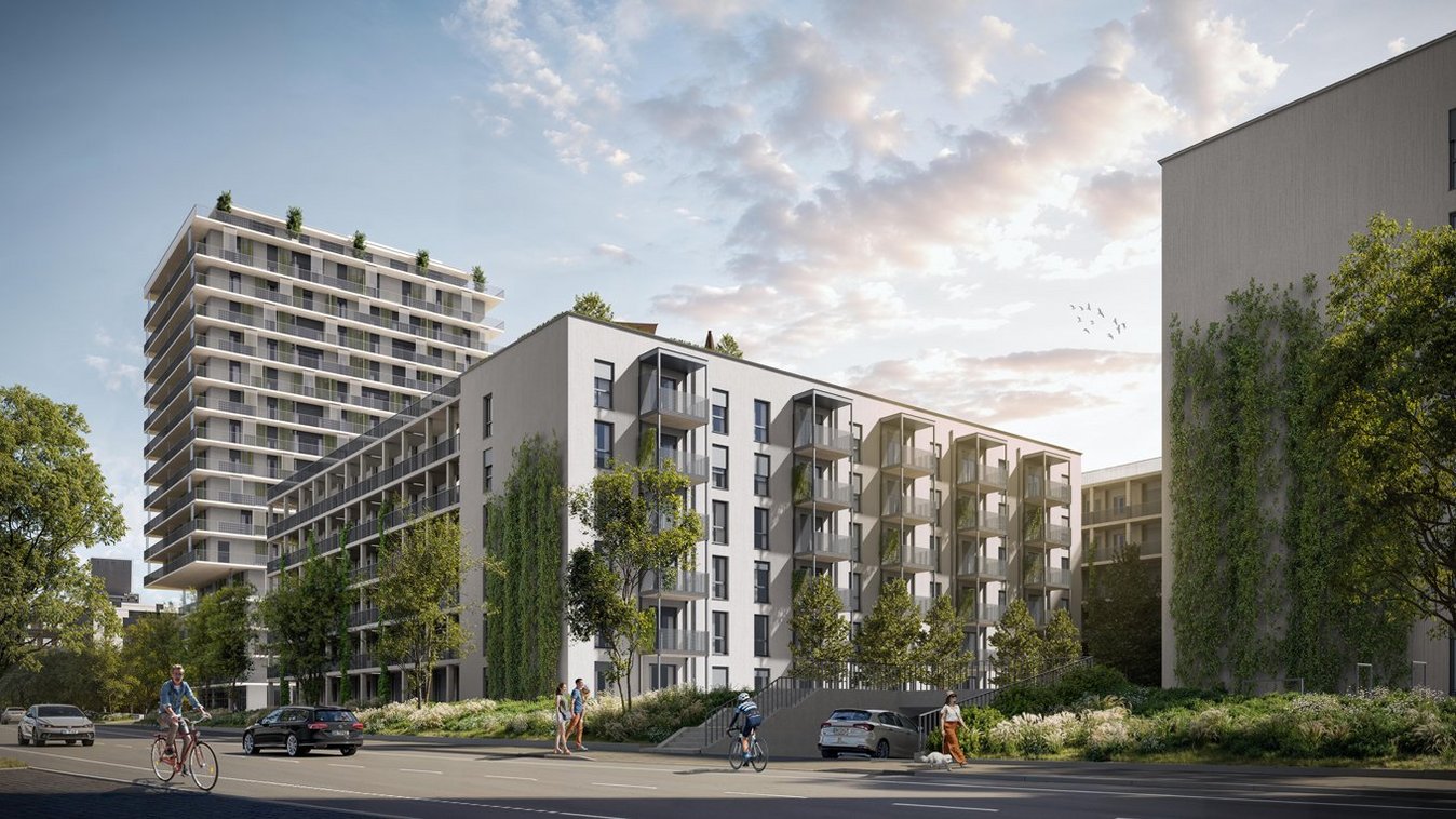 Mit begrünten Dachflächen, grünen Außenanlagen und Innenhöfen wird das Projekt die Aufenthaltsqualität verbessern und den Standort ökologisch und mikroklimatisch positiv beeinflussen.