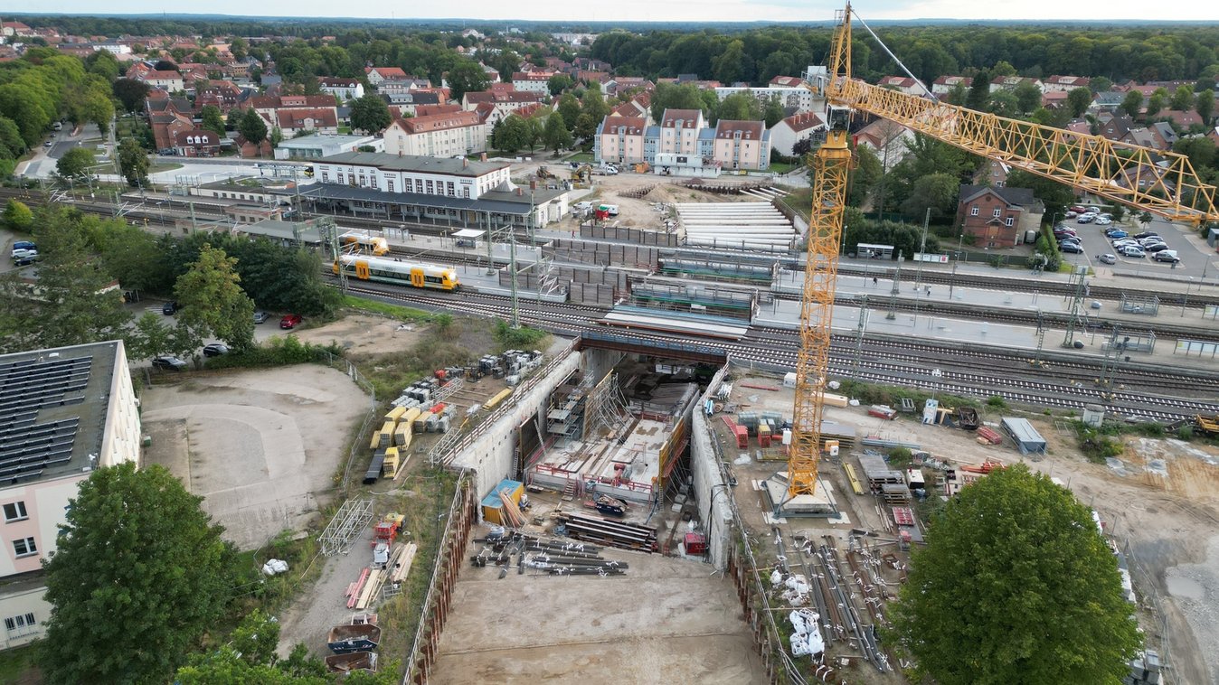 In Verbindung mit dem Neubau des Zentralen Omnibusbahnhofs (ZOB) und des Bahnhofvorplatzes wird das Umfeld des Bahnhofs völlig neu gestaltet. Als Ersatz für den ehemals vorhandenen Bahnübergang entsteht in km 170,8 + 28, bezogen auf die Strecke 6100 Berlin - Hamburg, eine Eisenbahnunterführung mit anschließenden Trogbauwerken. Los 12 Ingenieurbau Eisenbahnüberführung übernimmt in einem neuen Auftrag die teilweise bereits ausgehobene Baugrube aus Los 13, der Implenia Spezialtiefbau GmbH GS Rhein Ruhr. Die Baugrube wurde weiter ausgehoben und in einer weiteren Zwischenebene, eine Aussteifung mit Gurtungen und Stahlrohrsteifen montiert. Aushub der Baugrube bis auf Endtiefe und Einbau einer Aussteifungssohle aus Beton d=0,8 m. Diese dient als Verschubbahn der EÜ Rahmen.
