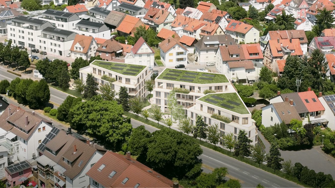 Das Projekt wird im KfW55-Standard erstellt. Es kommen sowohl begrünte Dächer als auch eine PV-Anlage zur Ausführung. Die Wärmeerzeugung erfolgt über drei Wärmepumpen.