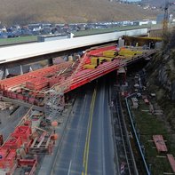 Instandsetzung einer Stahlseil-Hängebrücke über den Rhein, Abbruch und Neubau der Rampenbauwerke auf beiden Rheinseiten, in mehreren Verkehrsphasen unter Aufrechterhaltung des Verkehrs (MIV, IV, ÖPNV).