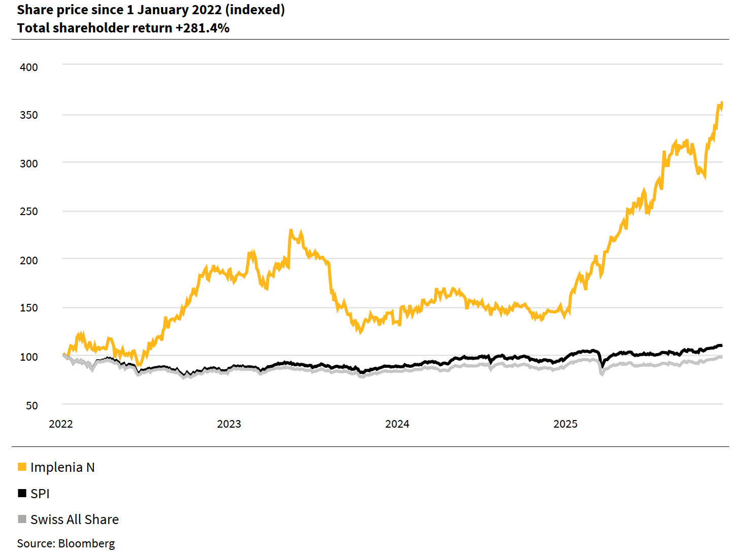 The average number of shares traded each day rose to approximately 62,000 in 2025, compared with approximately 29,000 in the previous year. The average daily trading volume rose to CHF 3.2 million (from CHF 0.9 million in 2024). Implenia’s closing price at the end of 2025 was CHF 76.50 (closing price in 2024: CHF 30.70), an increase of 149.2%.