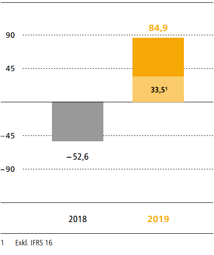Implenia delivered a solid operating cash flow and was able to finance all investments from its own business. Incoming payments from key projects helped to improve operating cash flow from CHF 16.1 million in the previous year to CHF 143.5 million (excl. IFRS 16: CHF 92.3 million). Free cash flow came to CHF 84.9 million (excl. IFRS 16: CHF 33.5 million; 2018: –52.6 million).