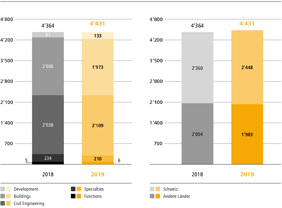 At the end of 2019, Implenia employed 8,867 people (full-time equivalents, excluding temporary employees), compared with 8,765 at the end of 2018.