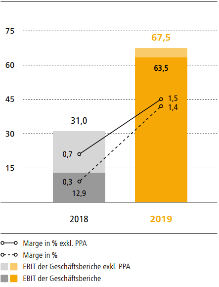 Implenia generated revenue of CHF 4,431 million in 2019 (2018: CHF 4,364 million), an increase of around 1.5% on the previous year. After adjusting for currency movements, revenue growth was 3.6%. As expected, the Group achieved EBITDA of CHF 186.8 million (excl. IFRS 16: CHF 130.8 million), up from the prior year’s CHF 89.7 million. A total of around CHF 20 million was spent on strategy implementation. This spending was concentrated mainly on Value Assurance, supplier consolidation and contract renegotiation, the ERP transformation project INSPIRE and implementation of the operating model and new organisational structure. Group operating income (excl. PPA) met expectations at CHF 67.6 million (2018: CHF 31.0 million). Consolidated profit was CHF 33.9 million (2018: CHF 0.5 million).