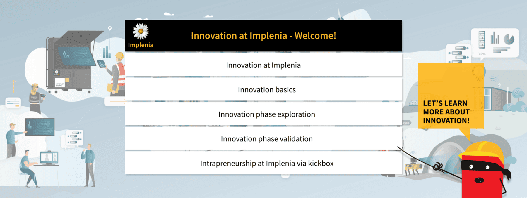 The Innovation e-learning course provides background knowledge and practical tools for driving innovation at Implenia. It is available in German, English, French and Italian.