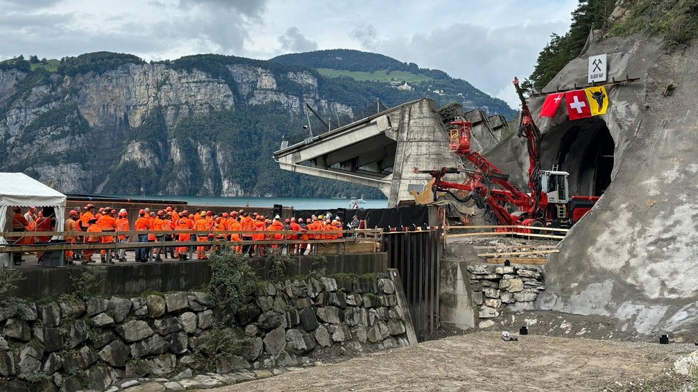 On September 26, 2025, the first blasting took place in Sisikon in the presence of numerous representatives of the client community, the Federal Roads Office (FEDRO), the project author and construction management, the Sisikon municipal council and the Sisikon school, followed by a ceremonial blessing of the tunnel by Saint Barbara, the patron saint of miners.