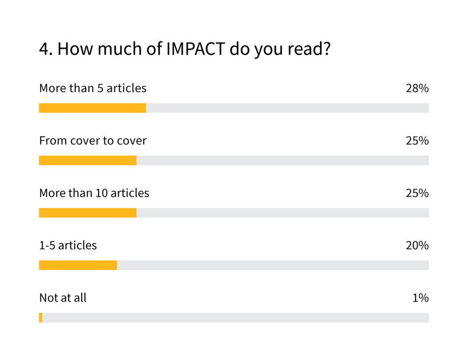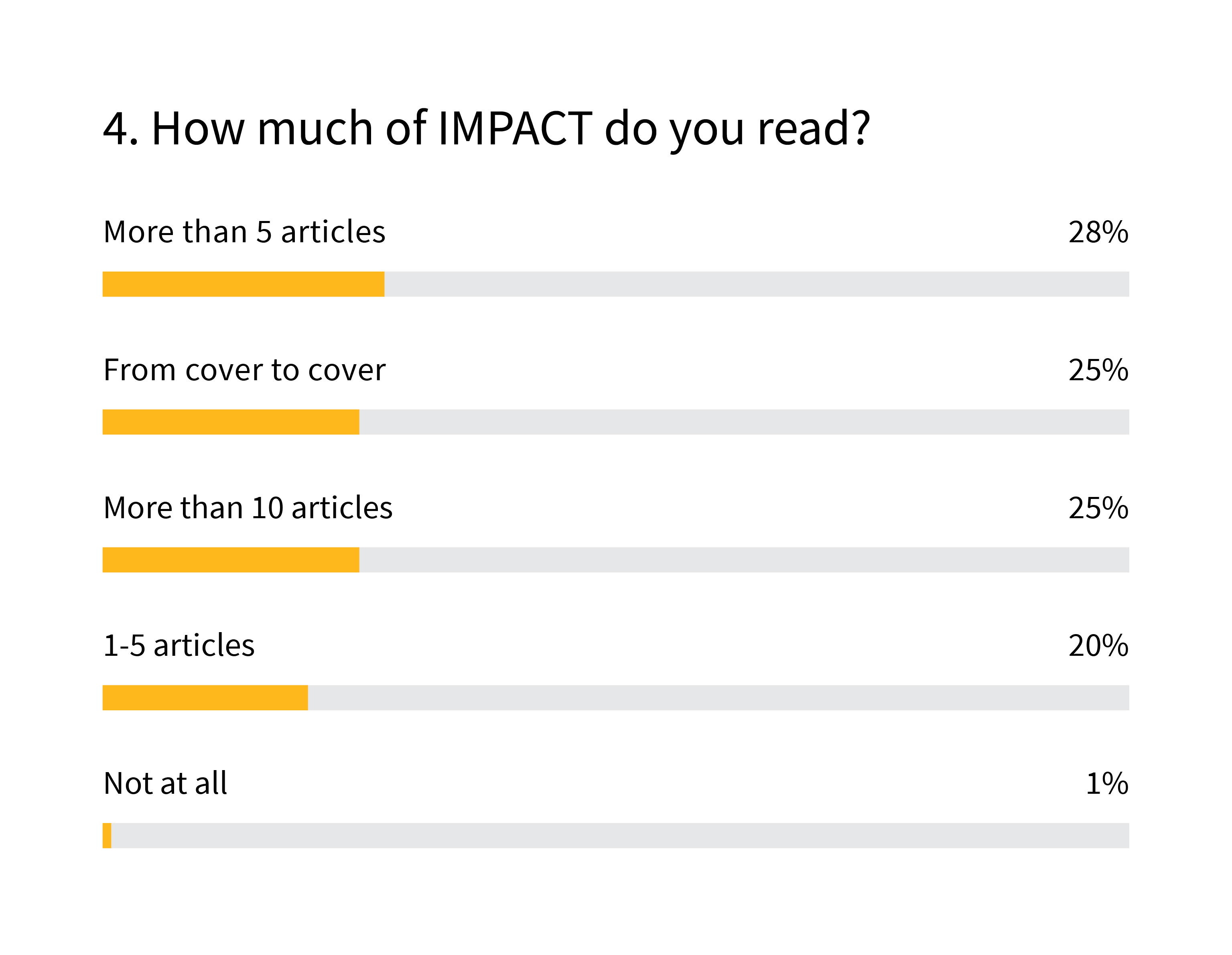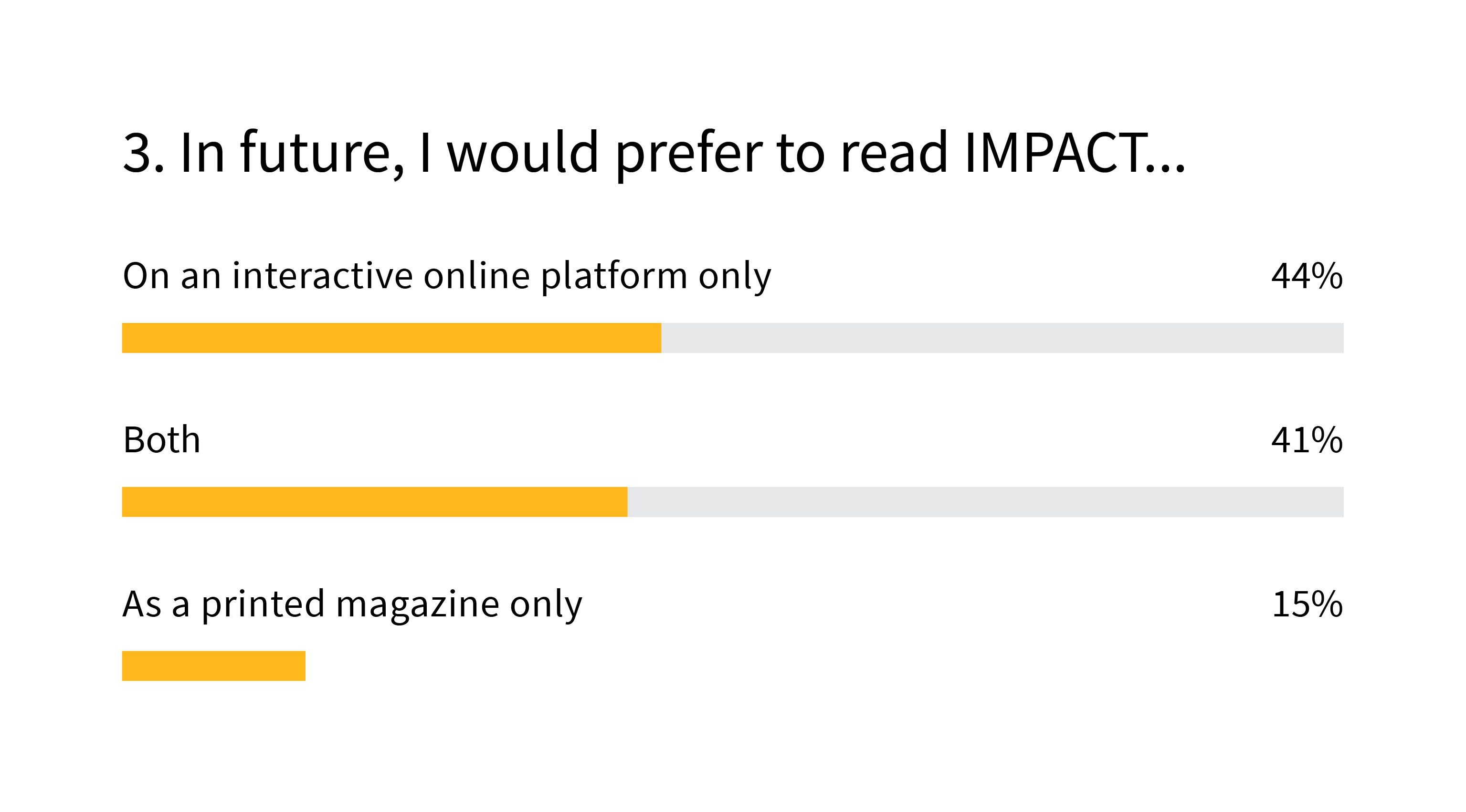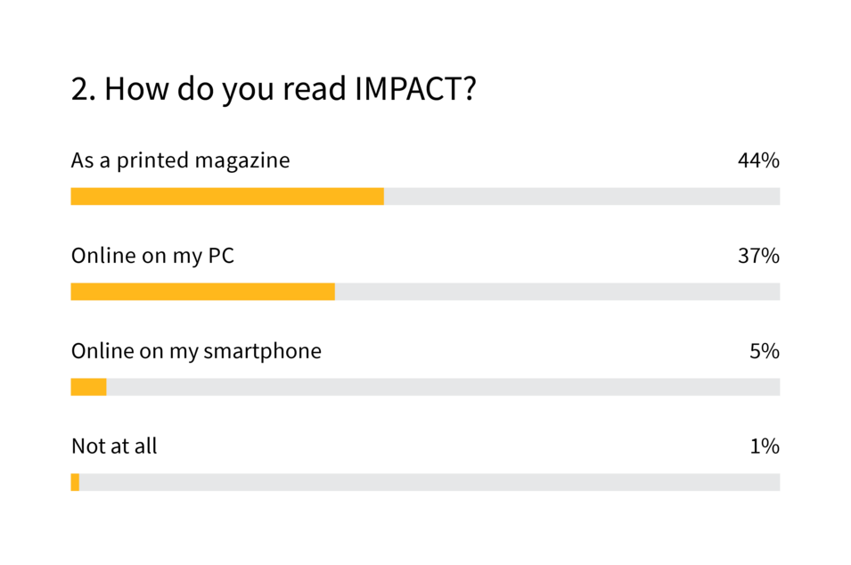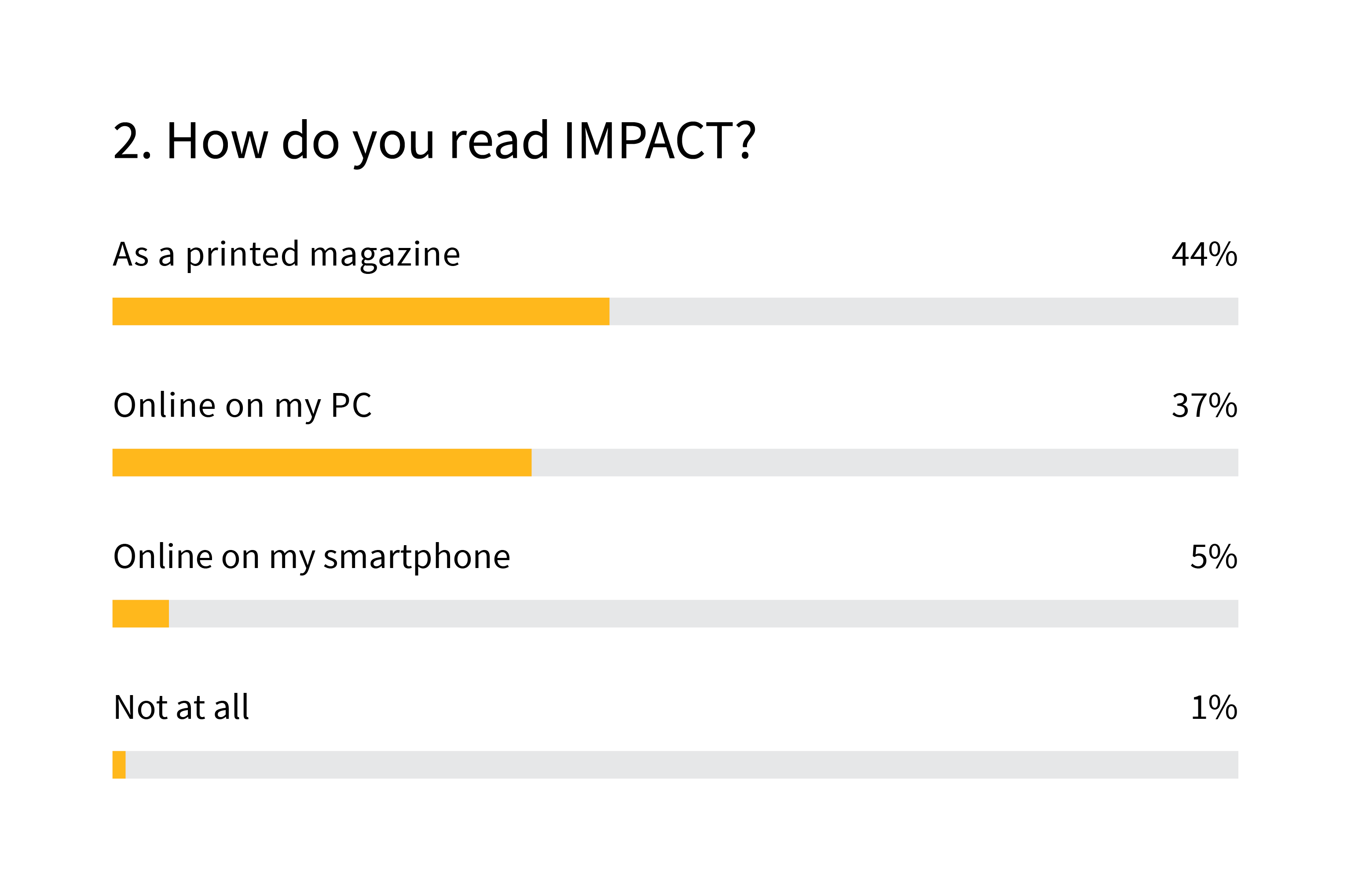 In print or online? The priorities here are not as clear. Today, 44% of you read the print version of IMPACT, while 37% consume its content online on a PC. It is a similar story when it comes to what you want in the future: While most of you like the combination of a print and an online version, 44% do not need the print version at all; 15% do not need the online version.