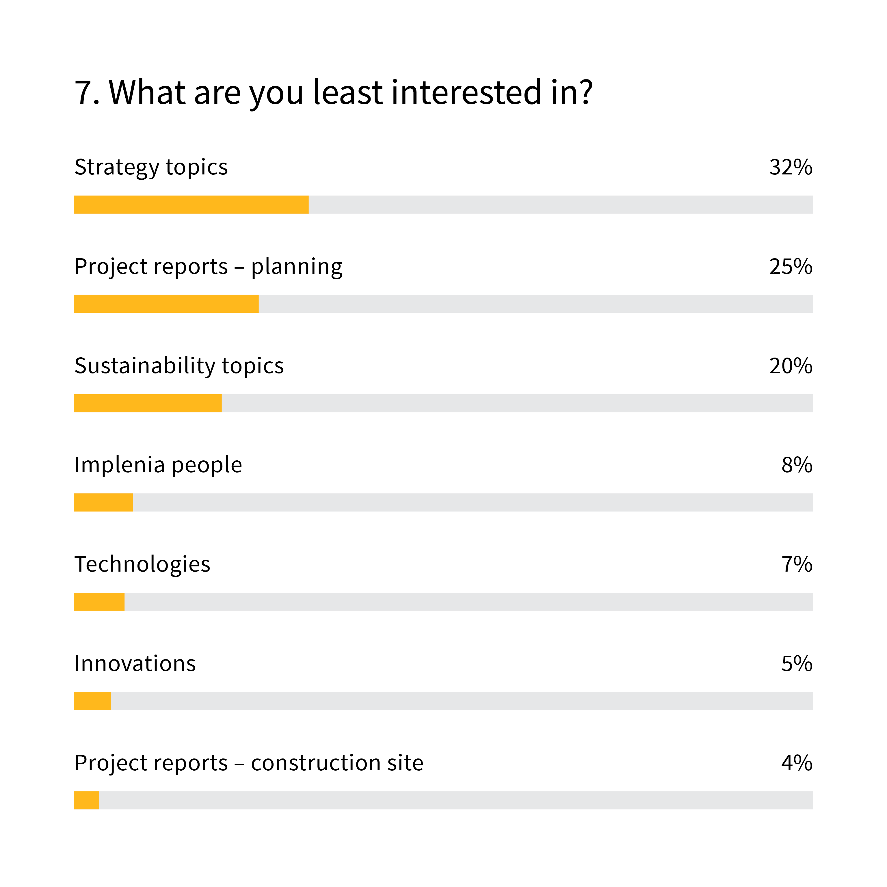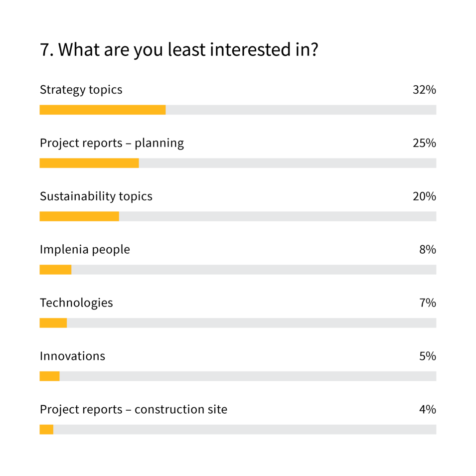 You have clear priorities when it comes to content. Reports on practical work and people are your favourites. You are also fascinated by exciting new technologies, but not so interested in strategy and planning topics, or sustainability.