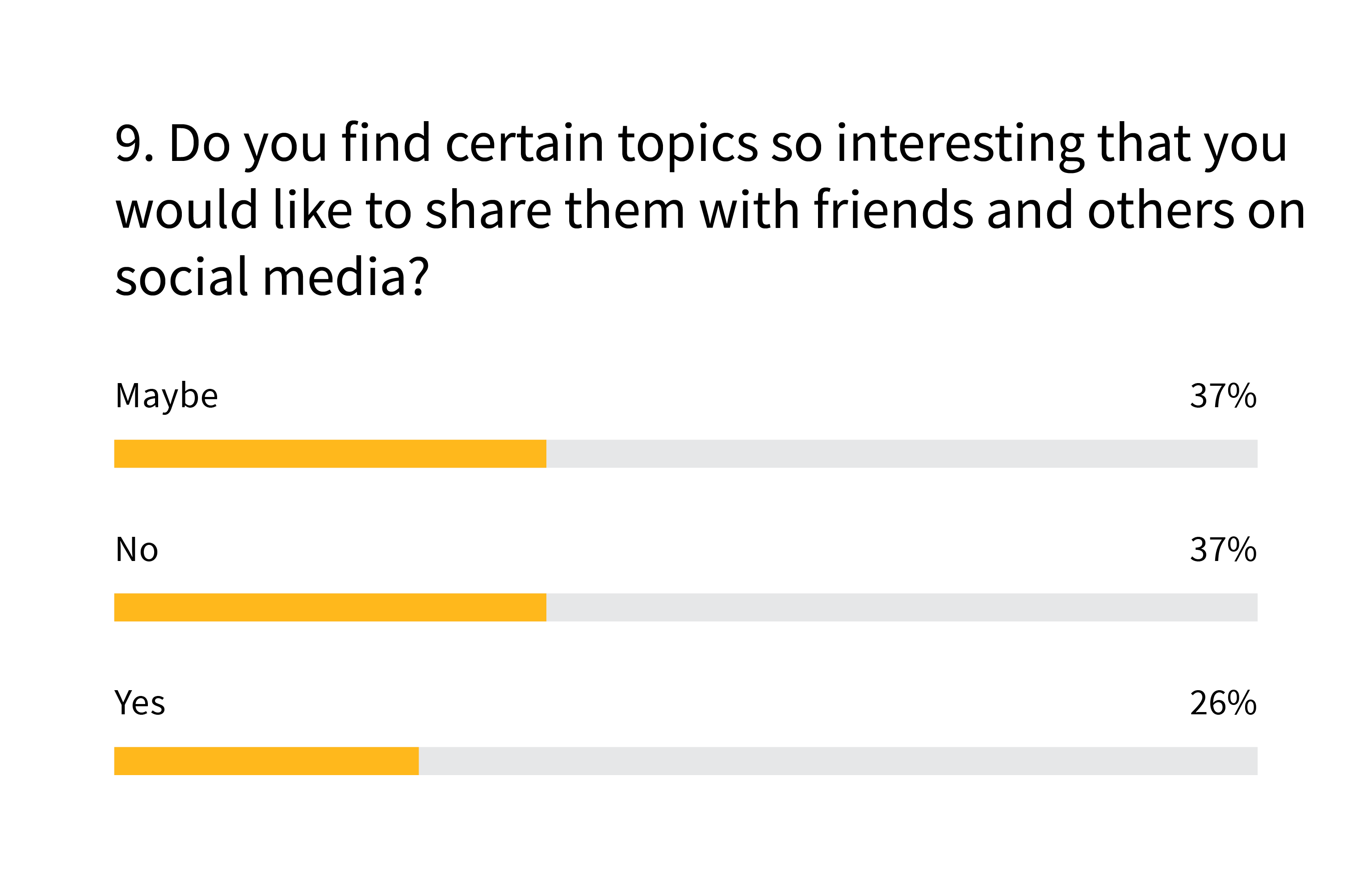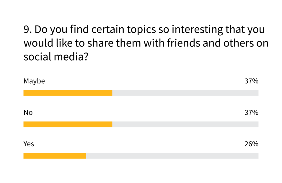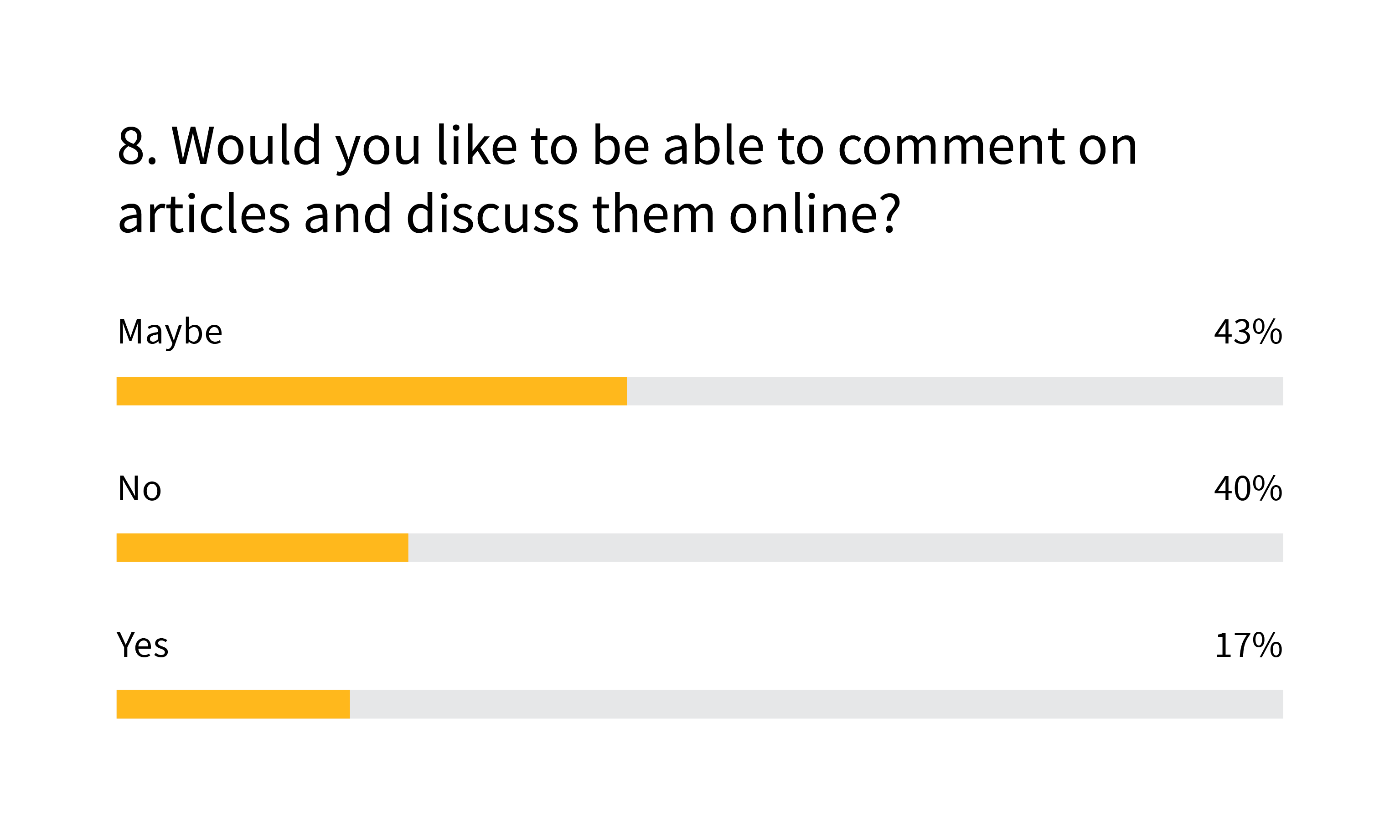 More dialogue? You’re not so sure. At the end of the survey, we asked you how much you want to comment on articles and share them on social media. Just 17% definitely wanted a comment function, 43% said maybe. In fact, 40% did not want this at all. You were also split on whether you want to share content on social media: 63% said yes or maybe, 74% no or maybe.