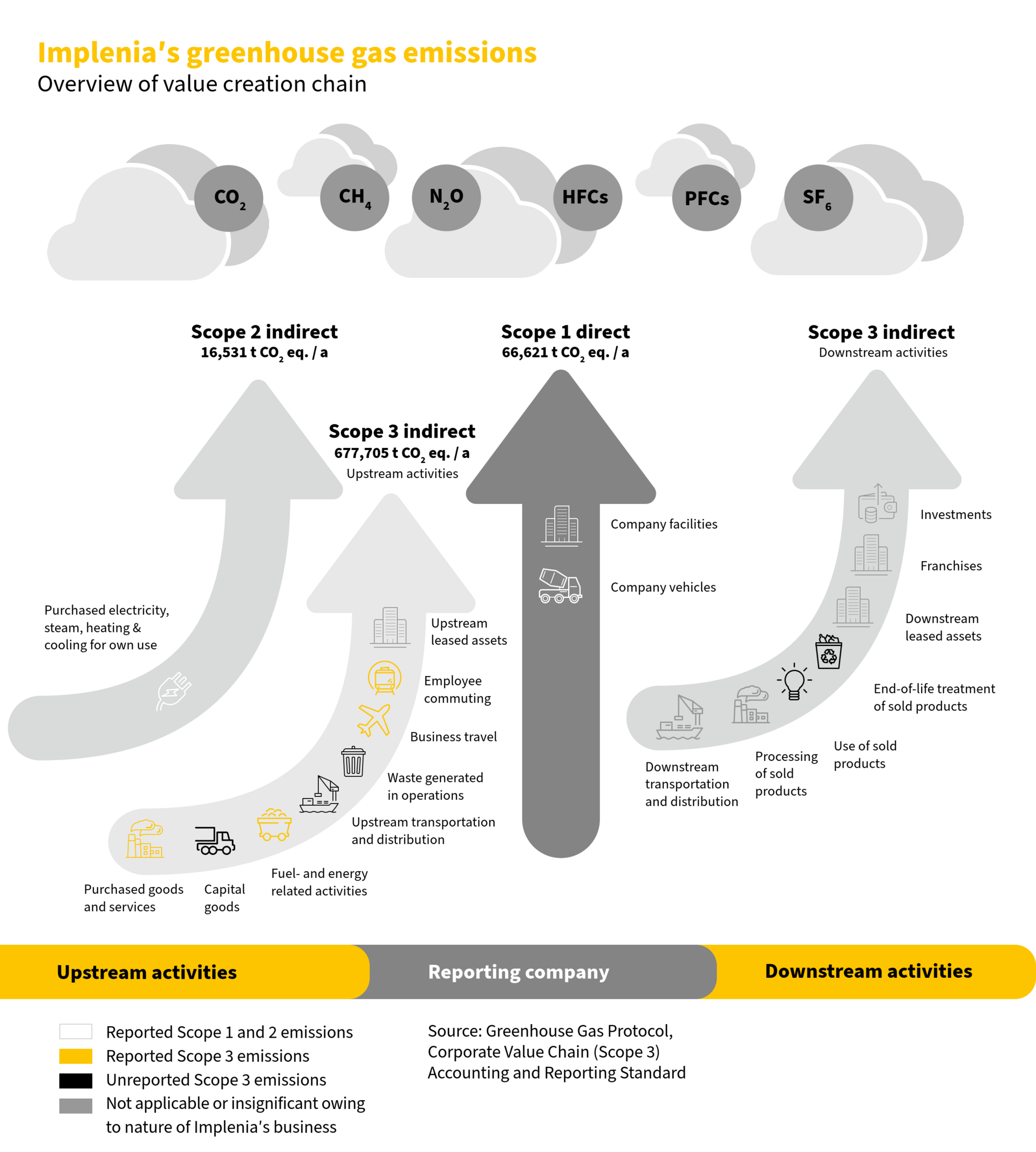 Implenia has already identified the key factors that affect the company’s CO2 footprint along the value chain. It has also assessed how relevant the fifteen Scope 3 categories are to the company’s activities based on the GHG protocol, internal and external databases and the construction industry benchmark. The following categories have been found to be relevant to Implenia: