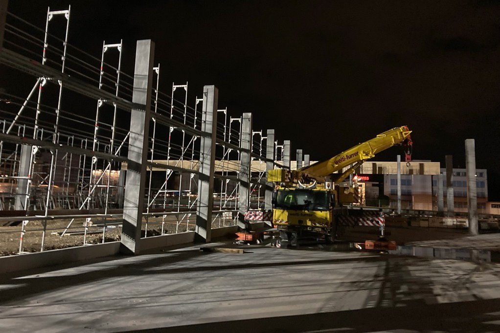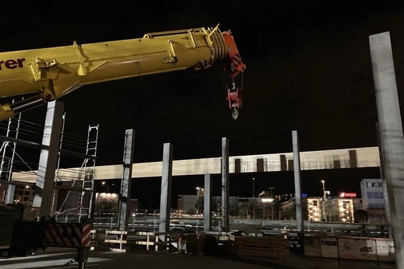 11.30 p.m., Zurich Airport. Air traffic is at a standstill. Instead, huge wooden beams float through the air. For the construction of the new Rächtenwisen cargo hangar, a large pneumatic crane is lifting 20-meter-long glulam beams. They form the supporting structure for a building that sets new standards in freight infrastructure at Zurich Airport and shows how the use of wood can also make large industrial and infrastructure buildings sustainable and fit for the future.