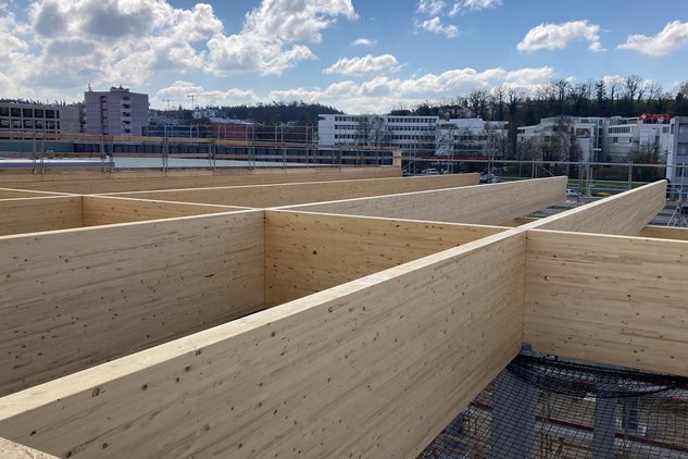 11.30 p.m., Zurich Airport. Air traffic is at a standstill. Instead, huge wooden beams float through the air. For the construction of the new Rächtenwisen cargo hangar, a large pneumatic crane is lifting 20-meter-long glulam beams. They form the supporting structure for a building that sets new standards in freight infrastructure at Zurich Airport and shows how the use of wood can also make large industrial and infrastructure buildings sustainable and fit for the future.