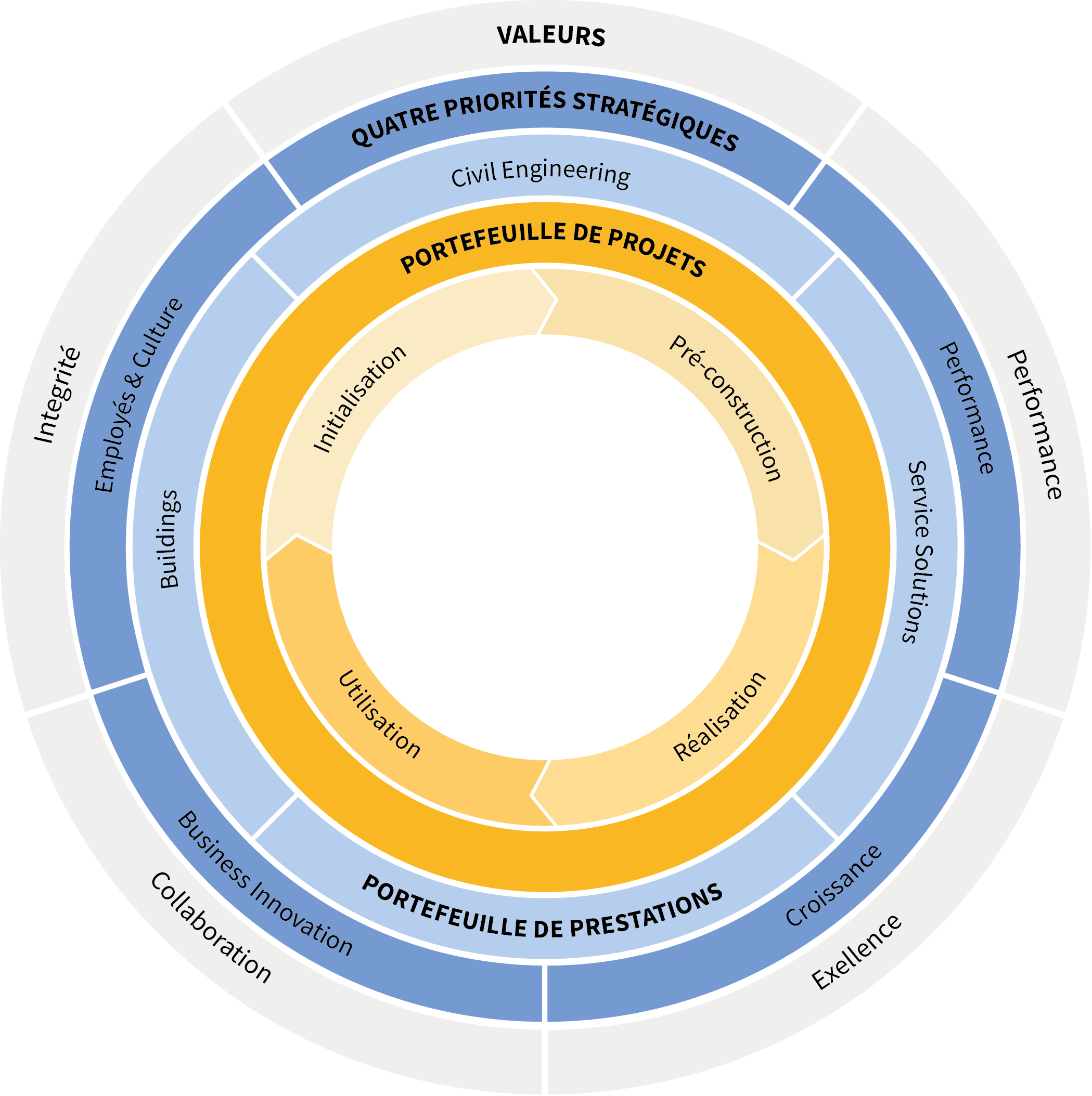 Prestataire de services de construction et d’immobilier leader au niveau multinational, Implenia suit une direction claire. Ses collaboratrices et collaborateurs répondent ensemble des valeurs de l’entreprise. Pour donner corps à sa vision et réaliser sa mission, Implenia suit quatre priorités stratégiques.