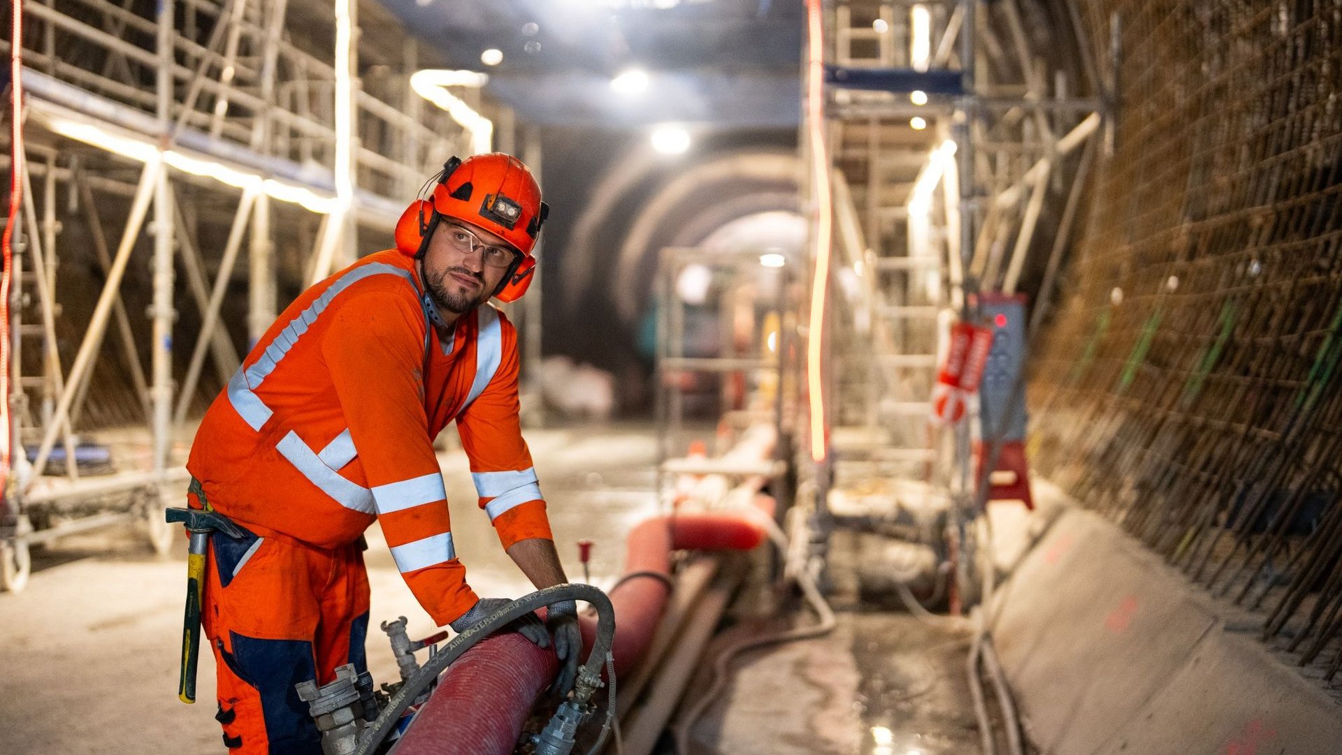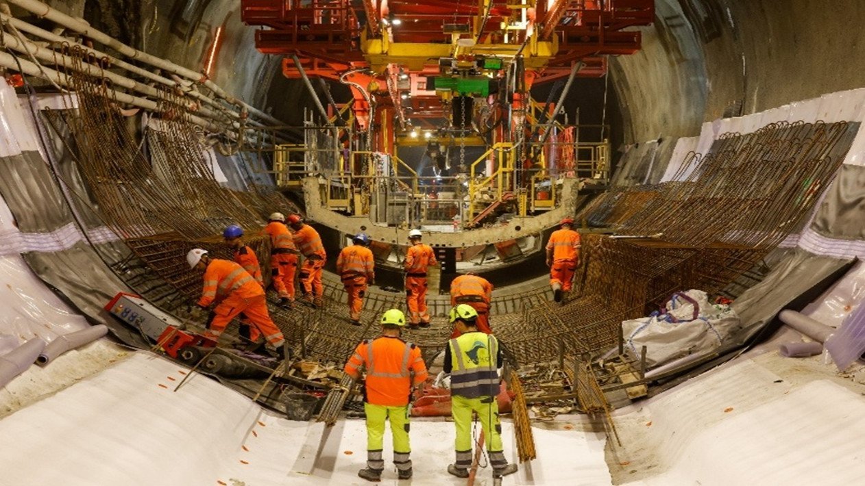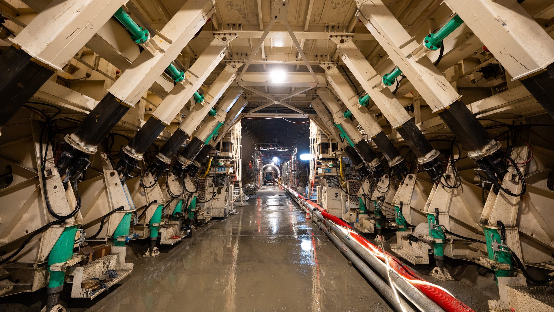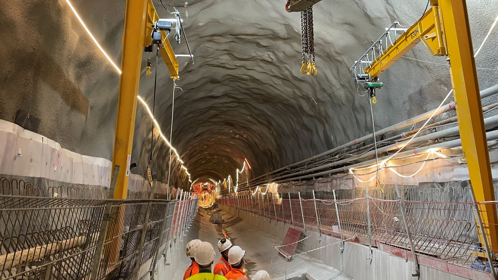 Les travaux sont actuellement réalisés sur la voie paire (tube de droite) tandis que la voie impaire (tube de gauche) reste dédiée à la logistique du creusement des fronts de taille, toujours en cours en amont. Lors d’une phase ultérieure, l’ensemble des outils seront doublés sur la voie impaire afin de poursuivre le revêtement.
