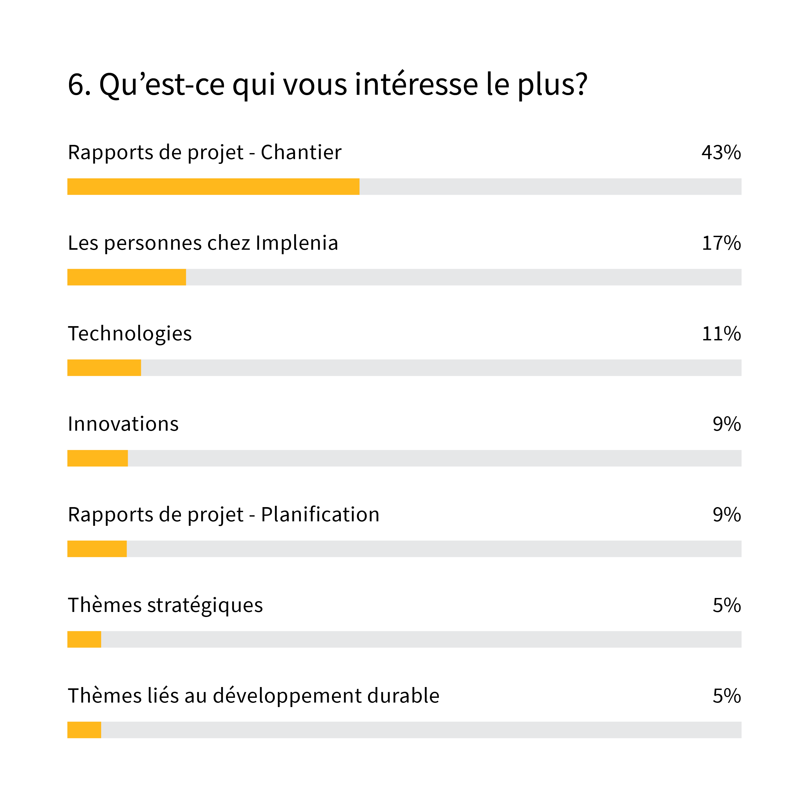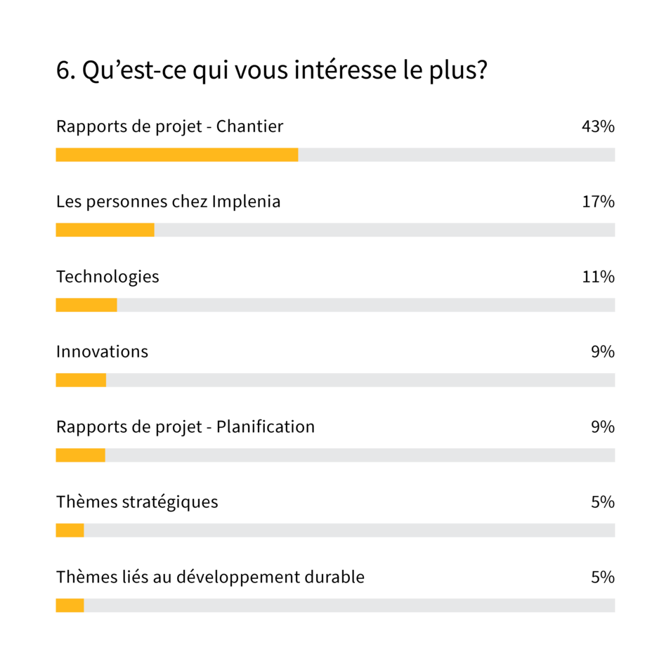 Même si beaucoup d'entre vous peuvent imaginer un avenir sans IMPACT en version papier, la version imprimée a un lectorat important et fidèle. Surtout pour ceux qui ne travaillent pas sur un ordinateur, il s’agit d’une source importante d'informations sur Implenia. Par la même occasion, les membres de votre famille et vos amis peuvent facilement jeter un coup d'œil au magazine et se faire une idée de ce que vous faites pour nous chaque jour chez Implenia. En outre, lMPACT version papier est disponible sur nos sites et donne à nos invités un aperçu passionnant de notre entreprise. Nous voulons garder tout cela à l’avenir.