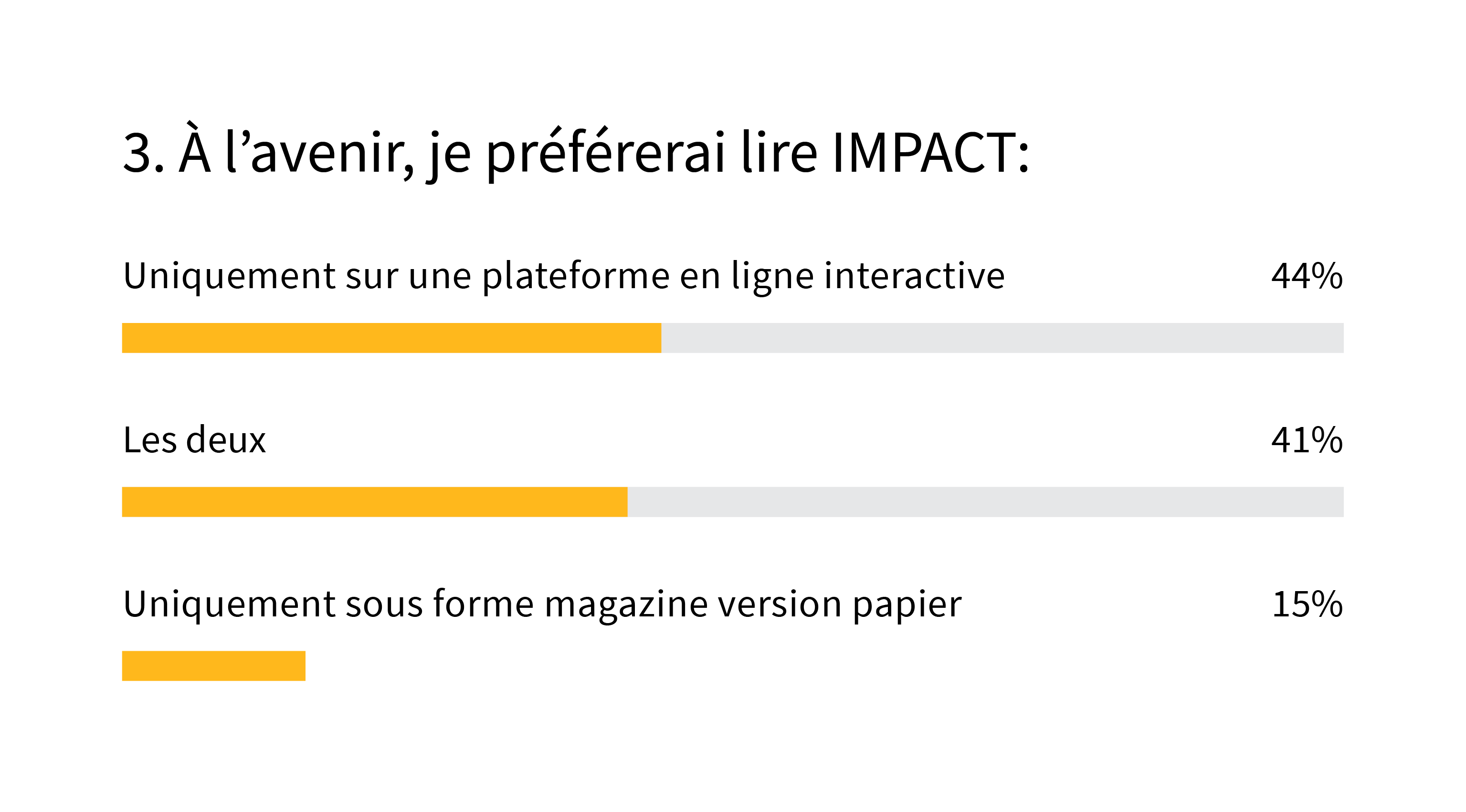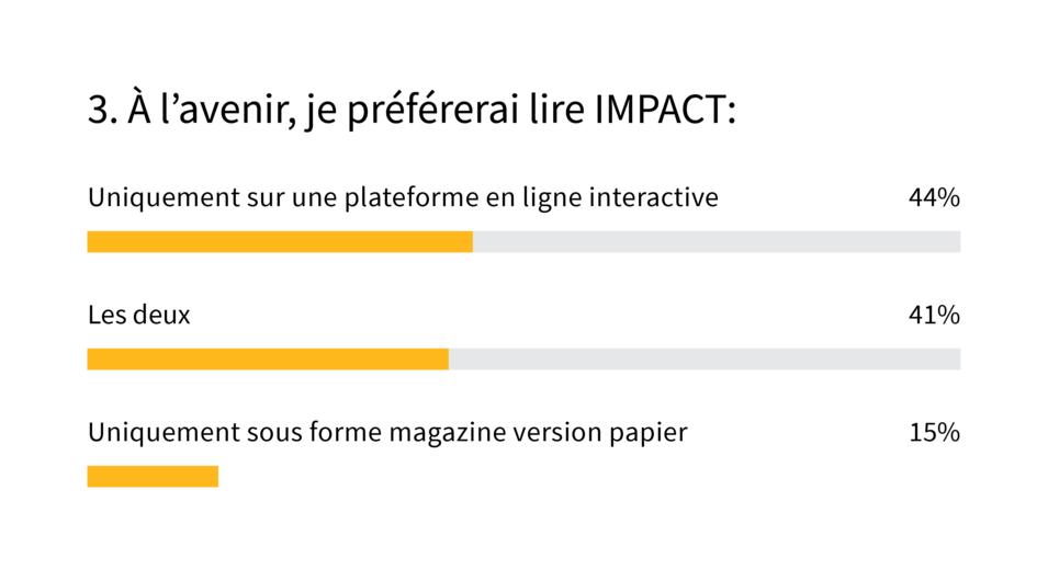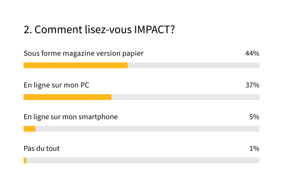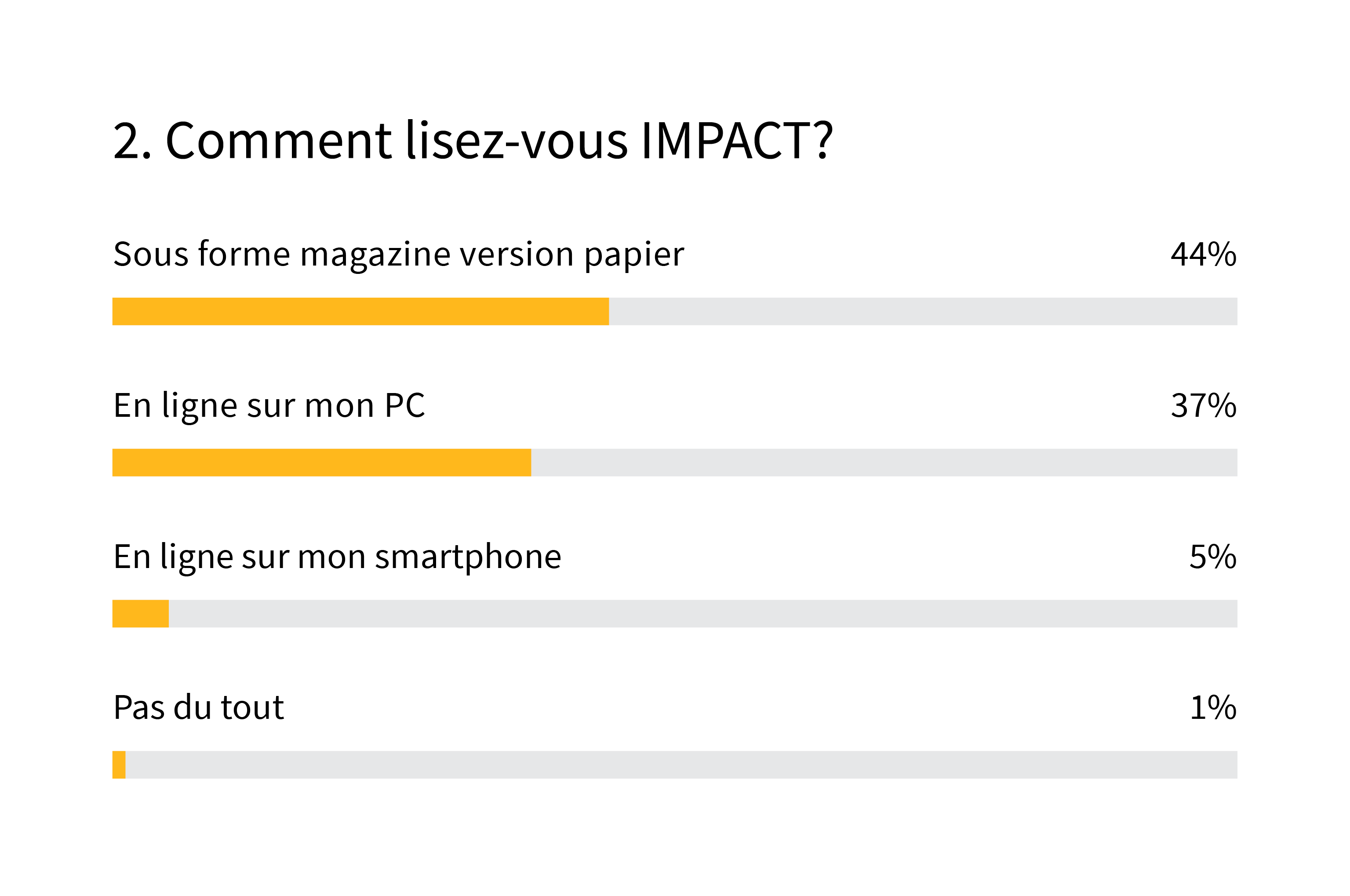 En version papier ou en ligne? Ici, les priorités ne sont pas si claires. Aujourd’hui, 44% d’entre vous lisent IMPACT en version papier. 37% lisent le contenu en ligne sur leur PC. Il en va de même avec vos souhaits pour l’avenir: Si la plupart d'entre vous apprécie la combinaison de la version papier et de la version en ligne, 44% pourraient se passer de la version papier; 15%, en revanche, n'auraient pas besoin d'une version en ligne.