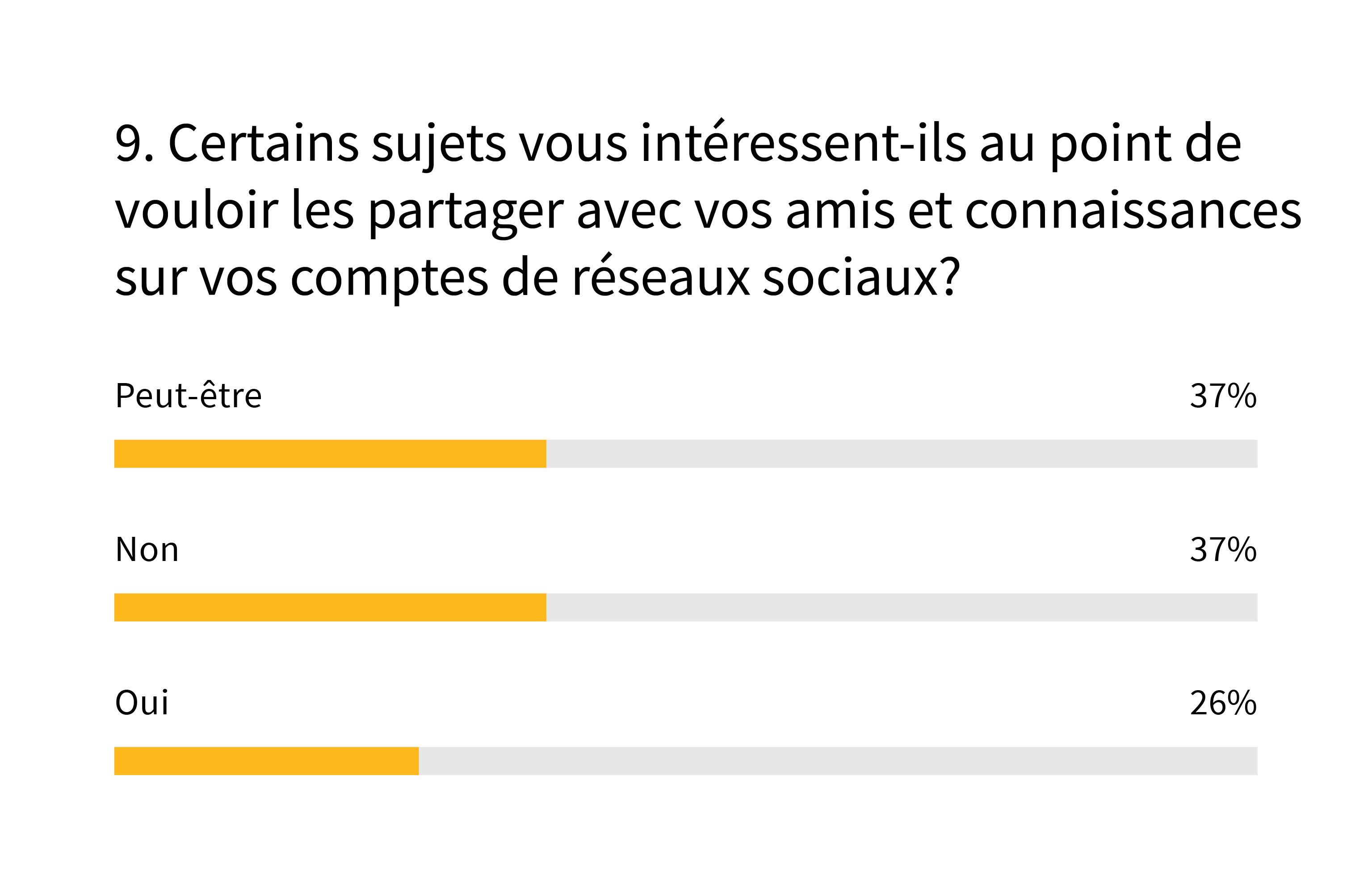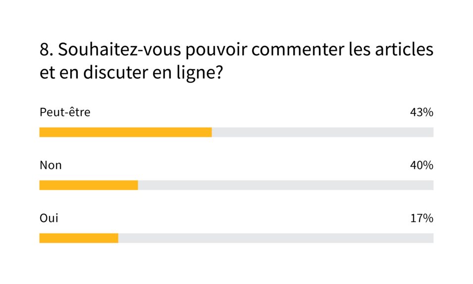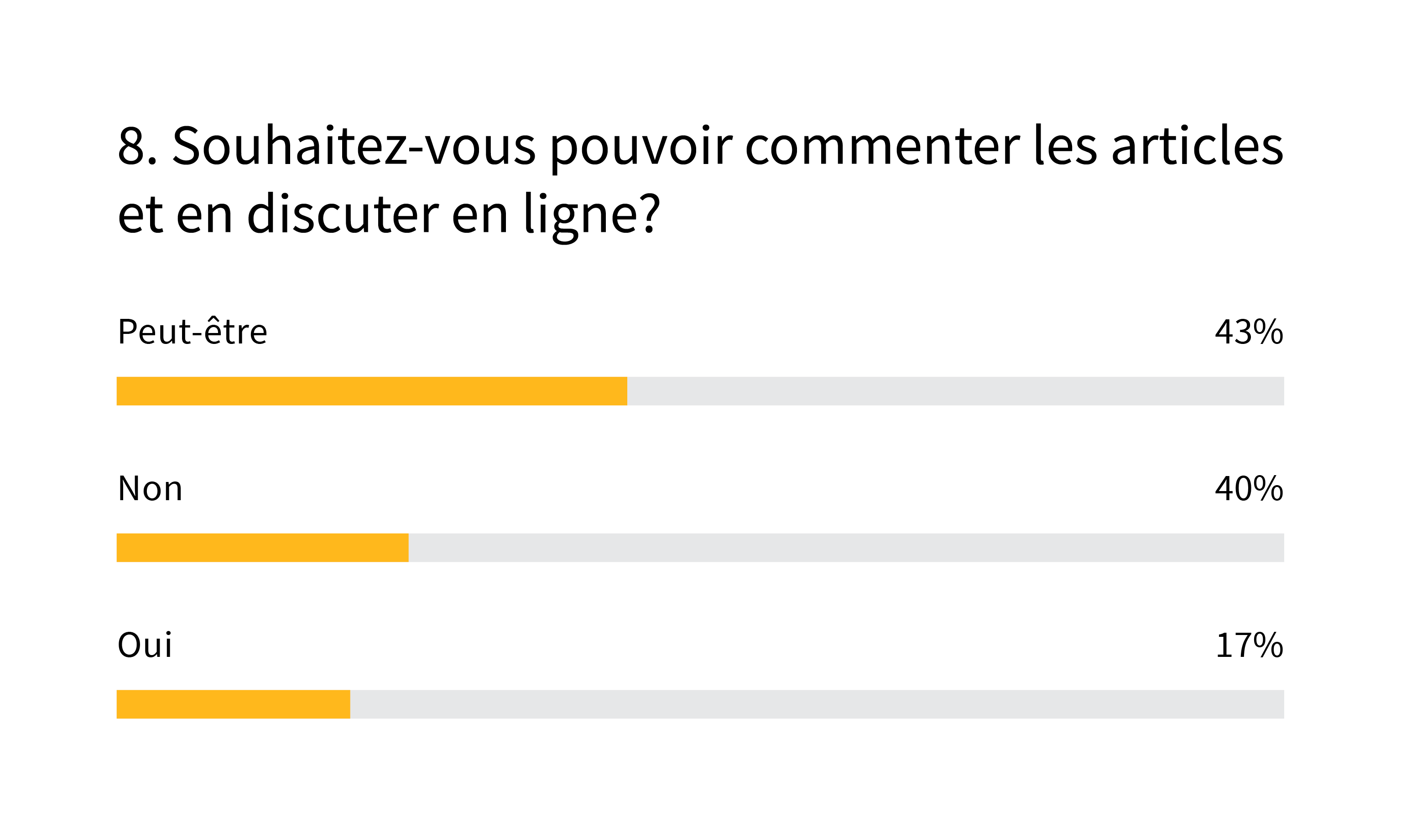 Plus de dialogue? Vous n’êtes pas encore complètement sûr. À la fin du sondage, nous voulions savoir dans quelle mesure vous aimez commenter les articles et les partager sur les canaux sociaux. Seuls 17% souhaitent une fonction pour commenter, 43% peut-être. Cependant, 40% pourraient s’en passer complètement. Et le désir de diffuser du contenu via les réseaux sociaux varie également: 63% sont pour ou peut-être pour, 74% sont contre ou peut-être contre.