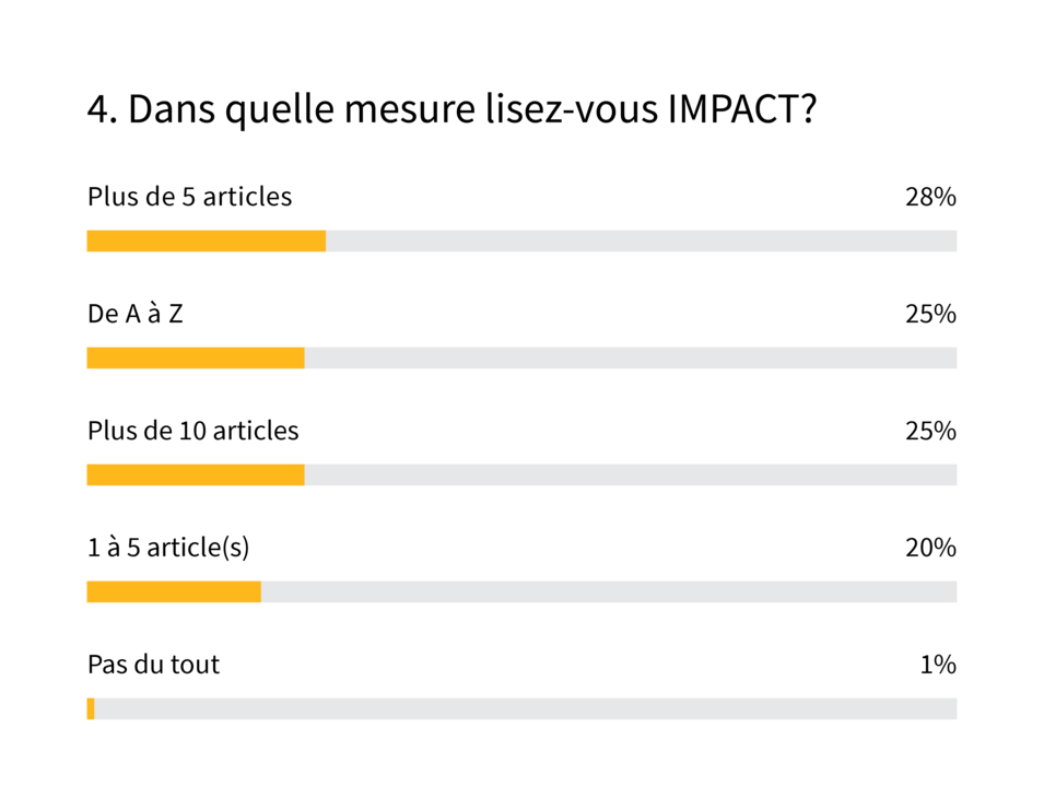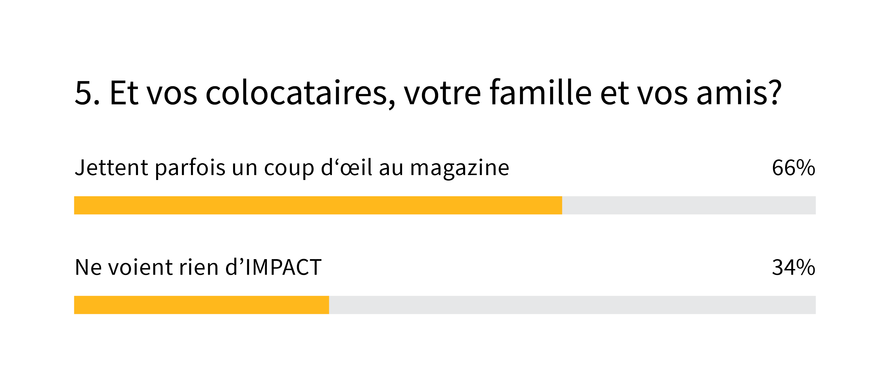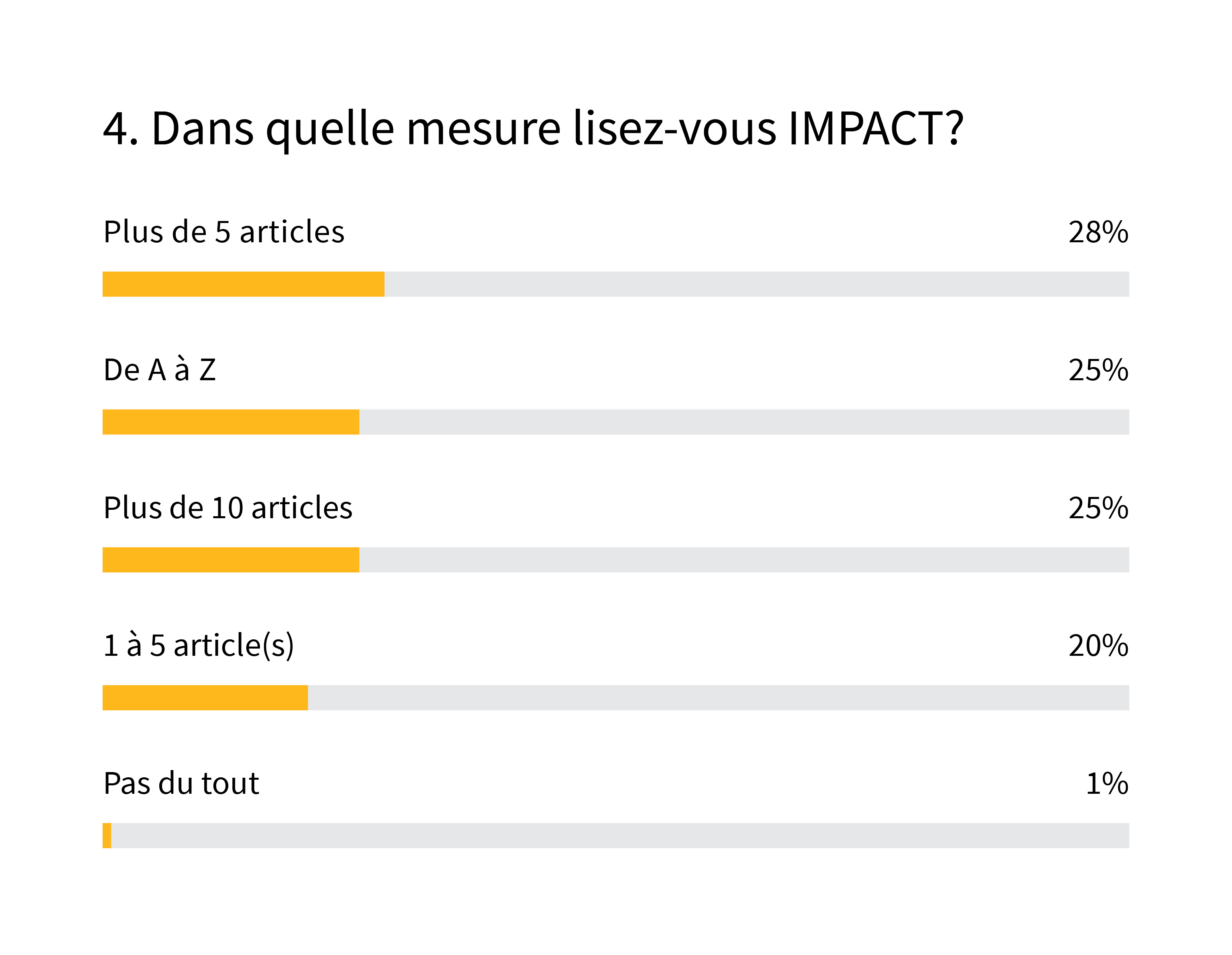 La bonne nouvelle pour nous: vous lisez IMPACT. Et avec une assiduité extrême: 78% déclarent lire plus de cinq articles par numéro; 25% lisent même assidûment le magazine de A à Z. Merci de votre confiance! Parallèlement, pour 66% d'entre vous, les membres de la famille et les colocataires jettent également un coup d'œil au magazine et se font ainsi une idée de ce que fait votre employeur.