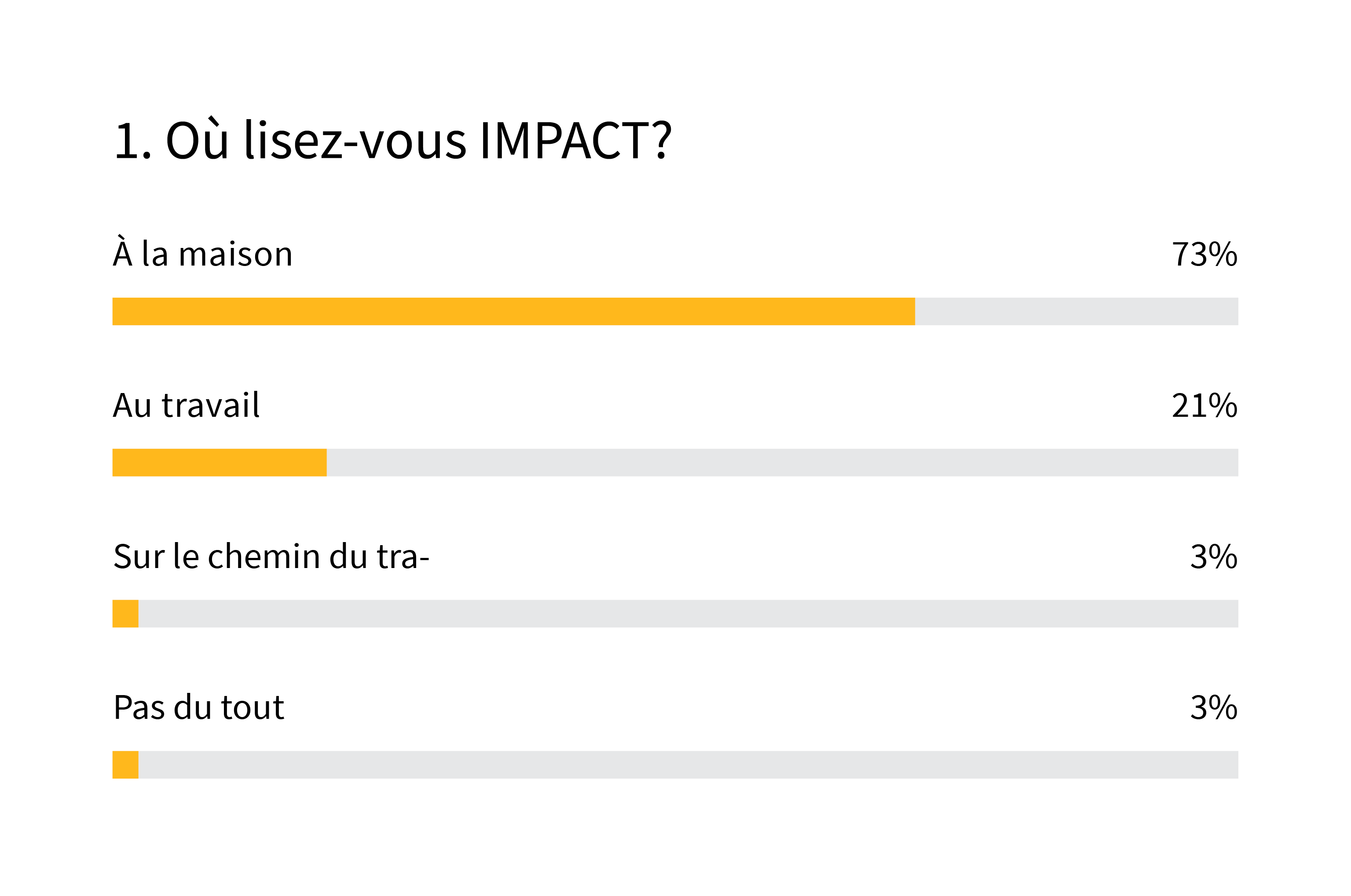 Pour la plupart d’entre vous, vous lisez IMPACT à la maison: Près des trois quarts des personnes interrogées déclarent lire notre magazine lorsqu'elles le reçoivent dans leur boîte aux lettres.