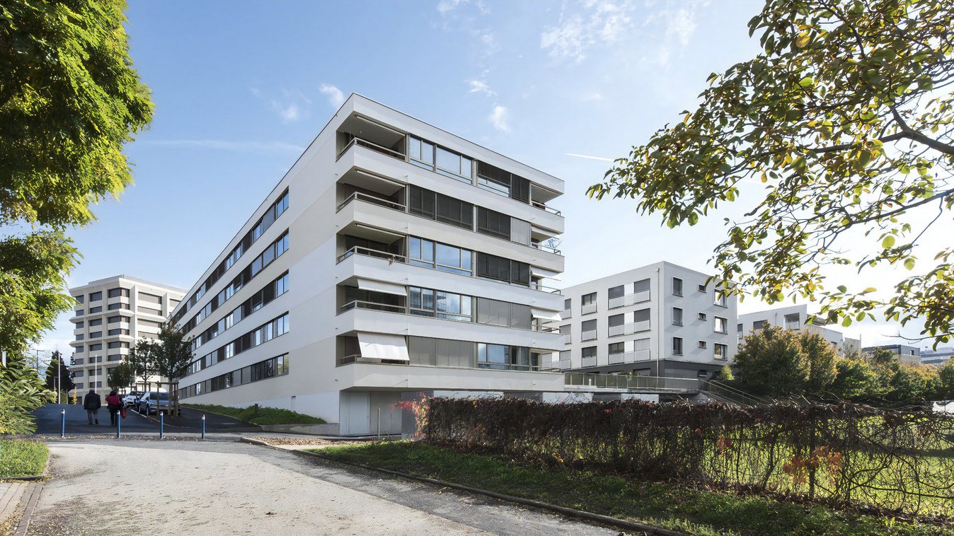 L'avenue Edmond-Vaucher est une voie perpendiculaire qui relie l'avenue de Châtelaine et le carrefour du Bouchet. Elle traverse en une longue ligne droite un paysage disparate où des jardins familiaux et un parc public constituent son poumon vert entre des immeubles d'habitation et quelques vestiges de la zone villa. Au milieu de ce contexte urbain, un beau terrain vierge est enfin densifié. En tant que grand volume à toit plat et à l'horizontalité marquée, le bâtiment exprime une contemporanéité claire qui s'est détachée des standards habituels de la construction économique. Les cages d'escalier sont disposées sur les façades, ce qui permet aux espaces communs de bénéficier d'une ventilation et d'un éclairage naturels généreux. Les grands appartements bénéficient d'une double orientation transversale, tandis que les plus petits sont mono-orientés et orientés vers le sud. L'organisation intérieure est très rationnelle et offre des chambres confortables de 12 mètres carrés et - presque partout - des salons lumineux prolongés par des loggias. Les sanitaires se trouvent au centre du corps de bâtiment et sont disposés de manière à éviter les nuisances sonores à l'intérieur de l'appartement ou vis-à-vis des appartements voisins.