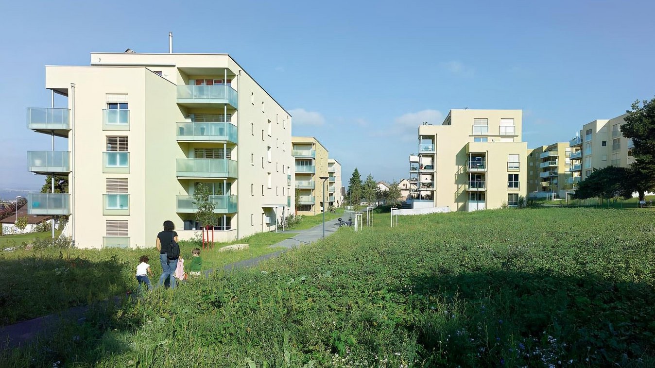 Il en résulte un quartier de 80 logements de 3 à 5 pièces, presque tous au bénéfice d’une triple orientation, dotés d’espaces collectifs destinés aux copropriétaires, ainsi que d’une piscine intérieure. L’ensemble se complète d’un parking couvert de 121 places. L’ensemble comprend 12’360 m2 de surface brute de planchers, dans un volume SIA de 59’630 m3 étagé sur quatre niveaux plus rez-de-chaussée et deux sous-sols. Enfin, la labellisation Minergie est inscrite au nombre des exigences programmatiques.