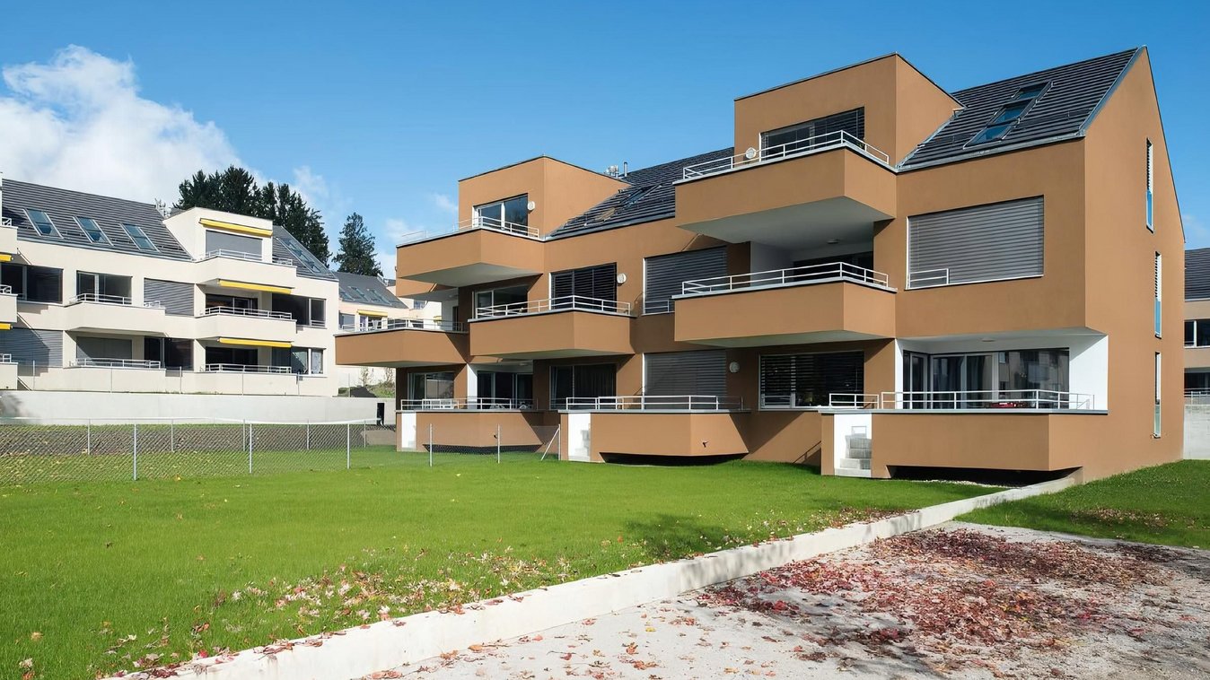 Les immeubles sont positionnés sur des plateaux indépendants qui permettent de gérer la pente du site et d’offrir une assise propre à chacun. À l’amont, proche de la route de Berne, cinq bâtiments sont destinés à la location et en contrebas six immeubles sont destinés à la vente en PPE. Les immeubles sont décalés entre eux, en plan et en niveaux, pour obtenir le maximum de dégagements visuels. Les volumes sont travaillés pour utiliser le maximum du règlement, tout en gardant un aspect de masse travaillée. Les balcons, de grandes dimensions, sont intégrés dans ce jeu de volumes pour en renforcer l’aspect. L’ensemble du quartier présente une architecture identique afin d’en garantir l’unité. Une seule entrée, au sud, dessert la parcelle. Les véhicules accèdent directement dans le parking souterrain par une rampe qui relie les deux plateaux de logements. Ce qui permet d’éviter toute circulation motorisée en surface et privilégie les zones piétonnes. La parcelle est traversée d’est en ouest par plusieurs cheminements piétons qui relient les différents plateaux et immeubles du quartier.
