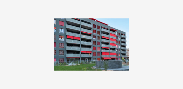 Accès à la propriété pour des familles. La résidence fait partie d’un îlot de quatre immeubles d’habitation et se situe en retrait et en parallèle à l’avenue des Grandes-Communes. Cette position dans l’axe est-ouest, respectant le type d’urbanisation des années 1960 de ce quartier d’Onex, marque aussi la limite entre le tissu d’habitation et les jardins familiaux de la Caroline, qui surplombent la zone verte qui longe le Rhône au nord. Le programme comprend 46 appartements, échelonnés du 31/2 au 6 pièces, de 86 à 148 m2. Les surfaces des pièces sont généreuses et tous les appartements proposés sont de type traversant avec une orientation principale nord-sud. Dans tous les appartements, les parties jour et nuit sont clairement séparées, avec les chambres au nord et les séjours-cuisines au sud. Chaque appartement possède un balcon-loggia, une cuisine équipée et deux à trois sanitaires indépendants. Les appartements en attique bénéficient en plus de grandes terrasses et ceux du rez-de-chaussée de petits jardins privatifs d’une centaine de m2. Le bâtiment a été vendu en PPE. Il est composé de six étages sur rez et attique et doté d’un sous-sol comprenant les locaux techniques, les abris de protection civile et un parking pour 46 voitures. L’ensemble des choix conceptuels appliqués à cette construction lui permet d’atteindre le niveau requis pour l’obtention du label Minergie standard 2008. Le bâtiment est raccordé au système de chauffage à distance de CADIOM. La mauvaise qualité du sol a nécessité des précautions particulières. L’immeuble est ainsi fondé sur des pieux et protégé par un système de dégazage autonome, utilisant des techniques fiables et déjà éprouvées lors de la réalisation des deux premiers immeubles du périmètre. Un réseau de tuyaux circule sous un radier étanche et une ventilation continue y souffle de l’air, afin de repousser et d’oxyder le gaz méthane susceptible d’être émis par les matériaux constitutifs de la décharge. D’autre part, les canalisations d’évacuation et les murs des sous-sols ont été étanchés avec soin, afin d’éviter toute migration incontrôlée du gaz méthane, tandis qu’une cheminée de sécurité a été installée jusqu’en toiture du bâtiment.