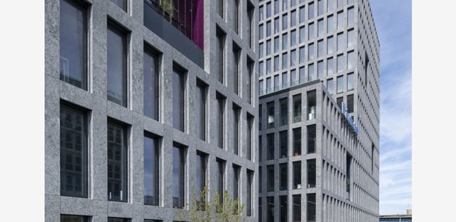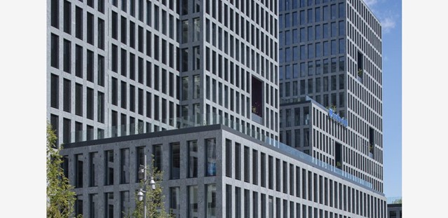 La structure est constituée d’un système de poteaux et de dalles préfabriquées. Le rythme régulier des façades, leur minéralité en granit, les fenêtres verticales, la modénature ont l’ambition d’échapper aux phénomènes de mode pour inscrire le projet dans la durée et une certaine intemporalité. La découpe expressive des volumes et la présence des loggias participent d’un langage contemporain qui revisite la vie sociale des espaces administratifs. La proportion entre pleins et vides optimise le rapport entre lumière naturelle et performance thermique de l’enveloppe. L’entraxe des piliers garantit une souplesse maximale dans la partition des bureaux. Les intérieurs se caractérisent par un aménagement de base « semi-fini ».