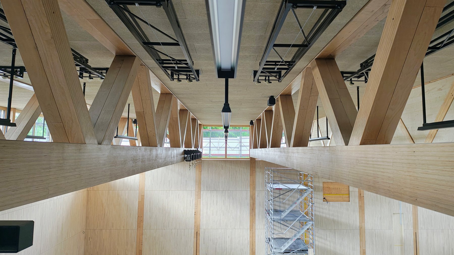 Besonders hervorzuheben ist das 30 Meter lange Hochleistungsfachwerk der Turnhalle, gefertigt aus Fichte und Baubuche. Die Konstruktion überzeugt durch ihren effizienten Materialeinsatz und ihre hohe Tragfähigkeit als herausragendes Beispiel moderner Ingenieurholzbaukunst. «Die Tragwerke ermöglichen grosse Spannweiten bei gleichzeitig filigraner Erscheinung und wurden speziell für die Anforderungen einer grosszügigen Turnhallenarchitektur entwickelt», erklärt Beda Weber, Leiter Implenia Holzbau. Vorgefertigt und als Bauteile geliefert wurden die Fachwerkträger von der Firma neue Holzbau AG. Implenia Holzbau baute die rund 3,2 Meter hohen Teile in der Turnhallendecke ein.