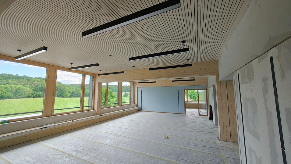 Die Turnhalle ist Bestandteil des Zentrumsbaus mit zwei Obergeschossen, die einen 270 m2 grossen Mehrzweckraum mit Bühne, Klassenzimmer mit Gruppenräumen sowie zwei Schulküchen beherbergen. Gleich wie der Zentrumsbau wurde auch das benachbarte Sekundarschulhaus in Holz-Hybridbauweise erstellt. Sichtbare Holzoberflächen im Innenraum schaffen eine warme Atmosphäre und tragen zum Wohlbefinden der Nutzerinnen und Nutzer bei.