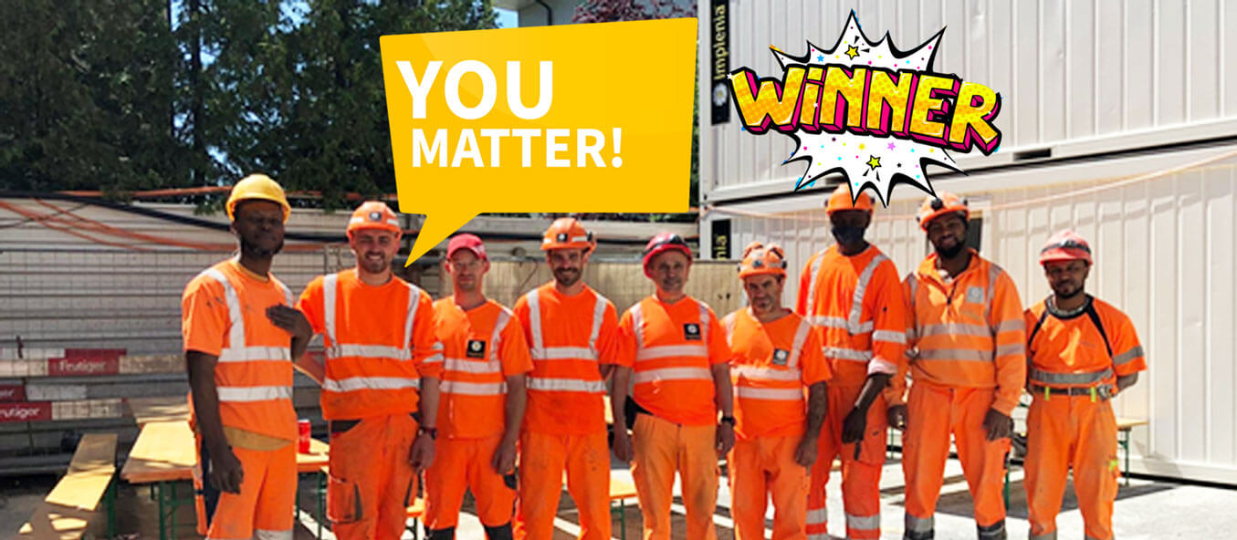 Die 2021 gestartete Kampagne YOU MATTER! ist nach drei erfolgreichen Jahren zu Ende gegangen. Zahlreiche Beiträge und eine hohe Beteiligung haben gezeigt, wie wichtig gegenseitige Wertschätzung bei Implenia ist – und bleibt. Auch wenn die Kampagne endet, lebt ihre Botschaft weiter: Im Arbeitsalltag zählt jede und jeder von uns! Heute bieten viele weitere Plattformen den Raum, einander Anerkennung auszudrücken. Danke an alle, die YOU MATTER! mit Leben gefüllt und Wertschätzung sichtbar gemacht haben.
