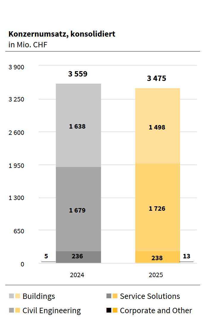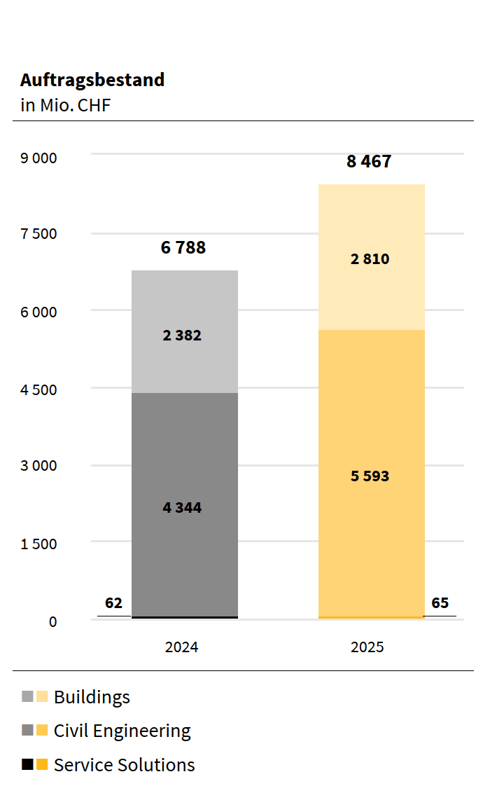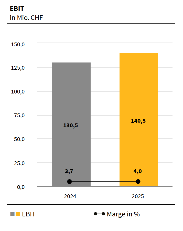 Implenia erzielte ein EBIT von CHF 140,5 Mio. (2024: CHF 130,5 Mio.). Die EBIT-Marge stieg auf 4,0 % (2024: 3,7 %). Der Umsatz der Gruppe ging leicht zurück auf CHF 3 475 Mio. (2024: CHF 3 559 Mio.). Der Auftragsbestand erhöhte sich auf CHF 8 467 Mio. (2024: CHF 6 788 Mio.), was einem Wachstum von 24,7 % entspricht. Daraus wird ab 2027 ein steigender Umsatz erwartet. Die vorkalkulierte Projektmarge des Auftragsbestands verbesserte sich von 7,3 % Ende 2024 auf 7,8 %.