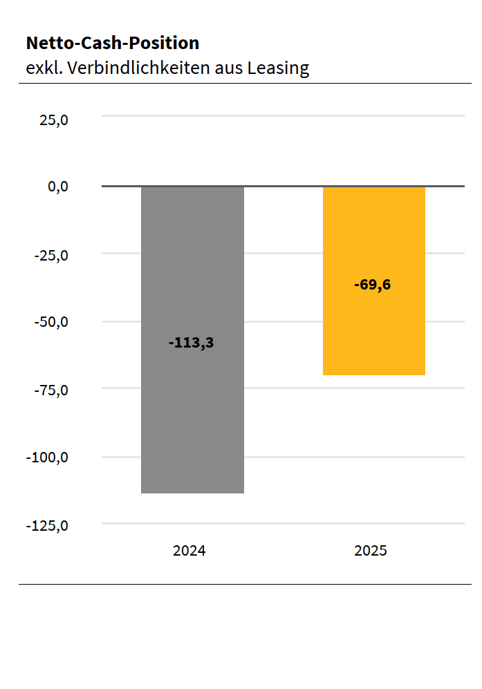 Netto-Cash-Position exkl. Verbindlichkeiten aus Leasing (per 31.12.) | (69 627) | (113 325) | 38,6 % | 39,4 % |