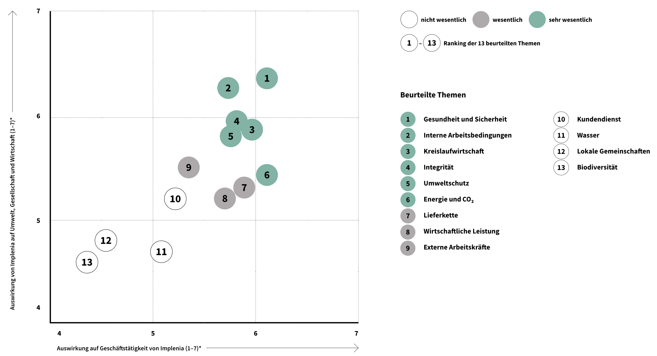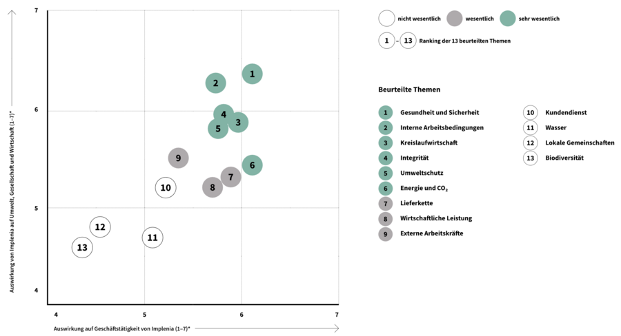 Der Ansatz der doppelten Wesentlichkeit bewertet einerseits die Auswirkungen eines Unternehmens auf Umwelt, Gesellschaft und Wirtschaft (Inside-Out-Perspektive) und andererseits die finanziellen Chancen und Risiken von Nachhaltigkeitsthemen für die Geschäftstätigkeit (Outside-In-Perspektive). Um die wichtigsten finanziell relevanten Themen zu identifizieren, führte Implenia eine interne Befragung von Mitgliedern des Verwaltungsrats, des IEC, des oberen Managements und bei den Nachhaltigkeitsspezialisten durch. Die Auswirkungen auf Umwelt, Gesellschaft und Wirtschaft wurden zudem von externen Stakeholdern in einer Online-Umfrage bewertet. Zu den Teilnehmenden zählten wichtige Kunden, Lieferanten, NGO, Investoren, Banken, Universitäten, Verbände, Gewerkschaften, Wettbewerber, Medien und Behörden.