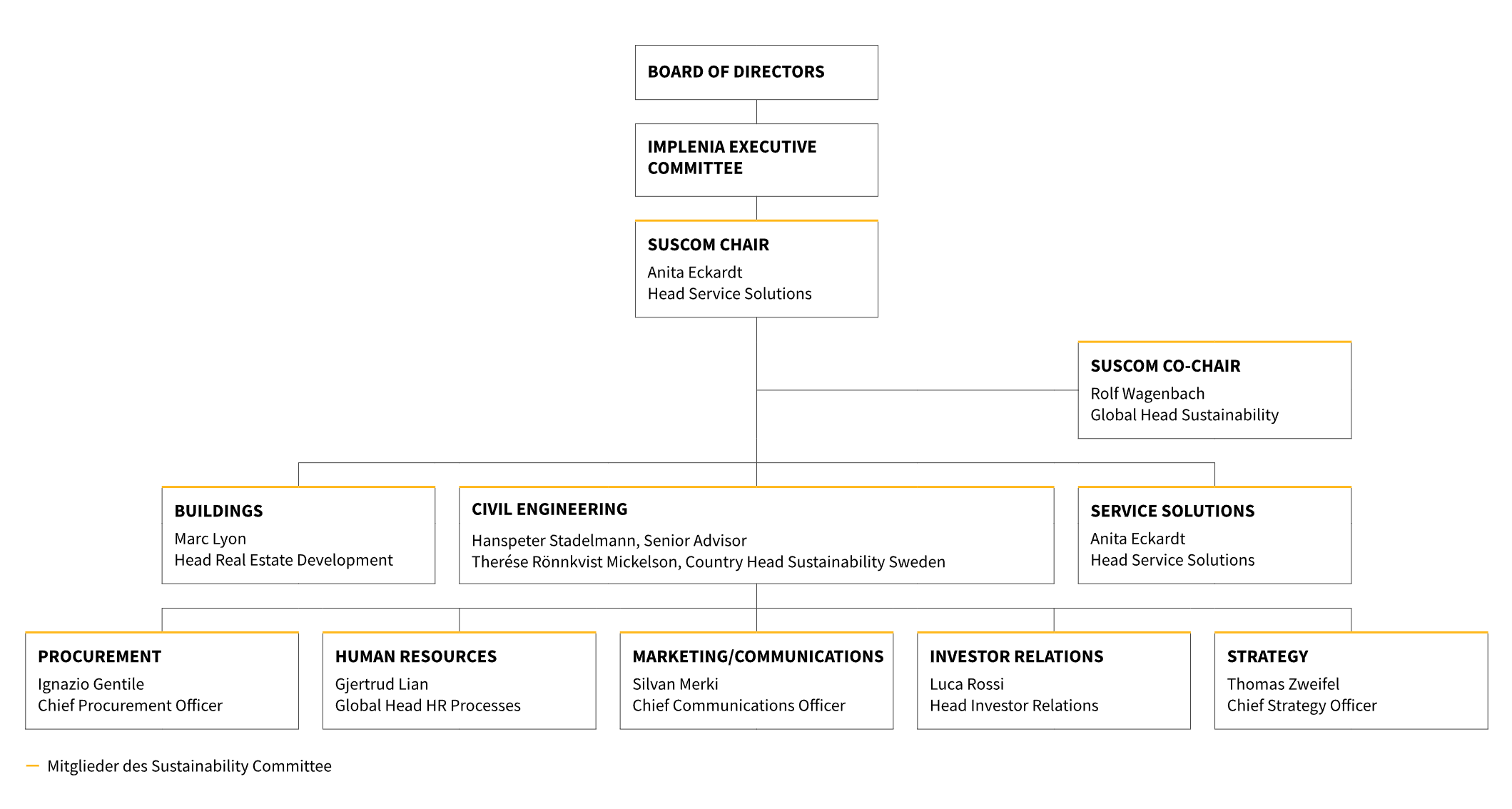 Die Vorsitzenden des SusCom (Head Service Solutions und Global Head Sustainability) vertreten zusammen mit dem Chief Strategy Officer die Ziele und wichtige Nachhaltigkeitsthemen im Implenia Executive Committee (IEC). Damit ist die strategische Steuerung der Nachhaltigkeit unmittelbar in der Konzernleitung verankert und mit der operativen Umsetzung verbunden.