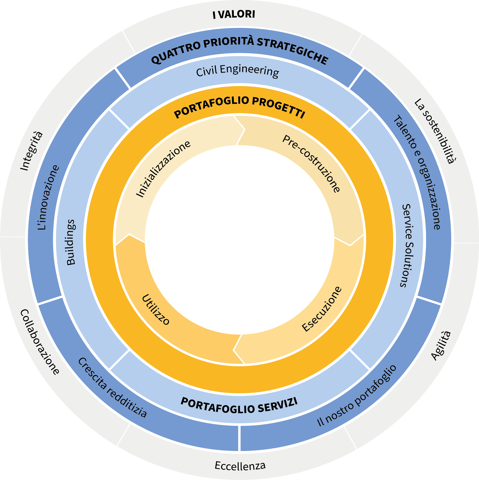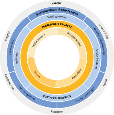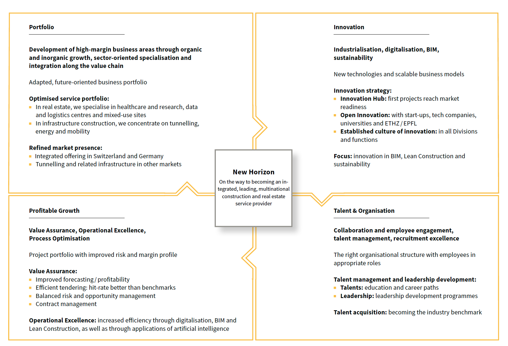 In quanto azienda multinazionale leader nel settore edile e dei servizi immobiliari, Implenia si è data obiettivi chiari e valori condivisi da tutti i dipendenti. Per realizzare la visione e attuare la missione, Implenia persegue quattro priorità strategiche.