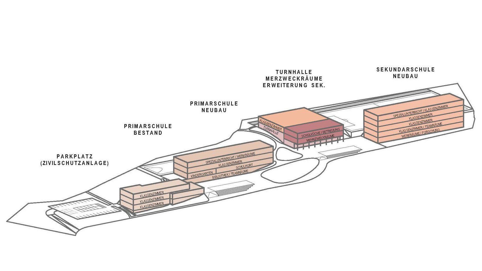 La progettazione e la realizzazione della palestra e dell'ampliamento della scuola secondaria sono state curate dallo studio di architettura Galli Rudolf Architekten e da AS Baumanagement GmbH in stretta collaborazione con l'impresa di costruzioni in legno Makiol Wiederkehr AG. Il risultato è un complesso scolastico chiaramente strutturato e luminoso, con un design aperto che invita le persone a imparare, muoversi e incontrarsi.