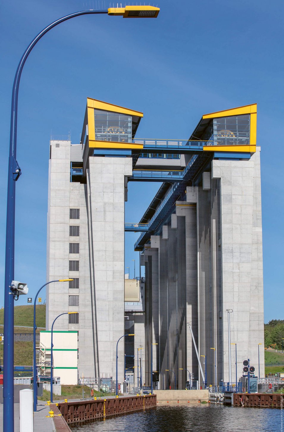 Nel complesso per il nuovo ascensore per navi di Niederfinow sono stati installati circa 65.000 metri cubi di calcestruzzo e cemento armato, 8.900 tonnellate di acciaio per cemento armato e 40.000 metri cubi di palancole in acciaio. Altrettanto imponenti sono le dimensioni dell’opera, con un’altezza di 55 metri, una larghezza di 46 metri e una lunghezza di 133 metri. «Nella realizzazione abbiamo dovuto ad esempio tener conto del fatto che i quattro tralicci isolati l’uno dall’altro si deformino sotto carichi diversi. I tralicci sono stati costruiti con una predeformazione, in modo che quando i carichi sono attaccati la posizione sia verticale», spiega Henning Schrewe. Ma l’ascensore per navi è un capolavoro anche dal punto di vista tecnologico, dotato di tecnologie moderne e controllato in modalità completamente elettronica.