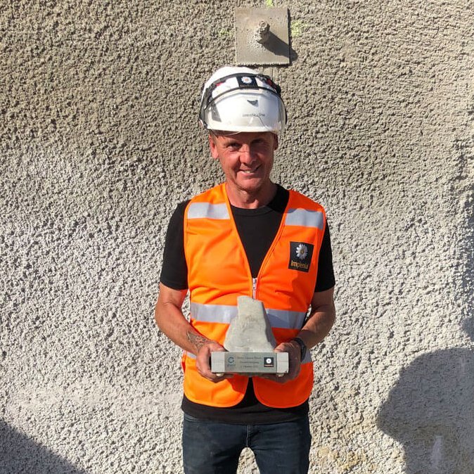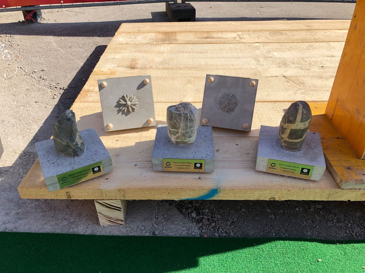 Die Idee für eine Grundsteinlegung und für das Bauherrengeschenk stammt von meinem Chef Markus Meier und wir haben uns überlegt, wie das umzusetzen wäre. Zufälligerweise hatten wir noch eine Vorlage einer Schalung mit eingefrästem Implenia-Logo auf der Baustelle und ich dachte mir, das würde in Kombination mit den Holzzapfen bestimmt cool und stylisch aussehen. Die Platten mit der Metallschrift haben wir extern produzieren lassen – und fertig war das Bauherrengeschenk!
