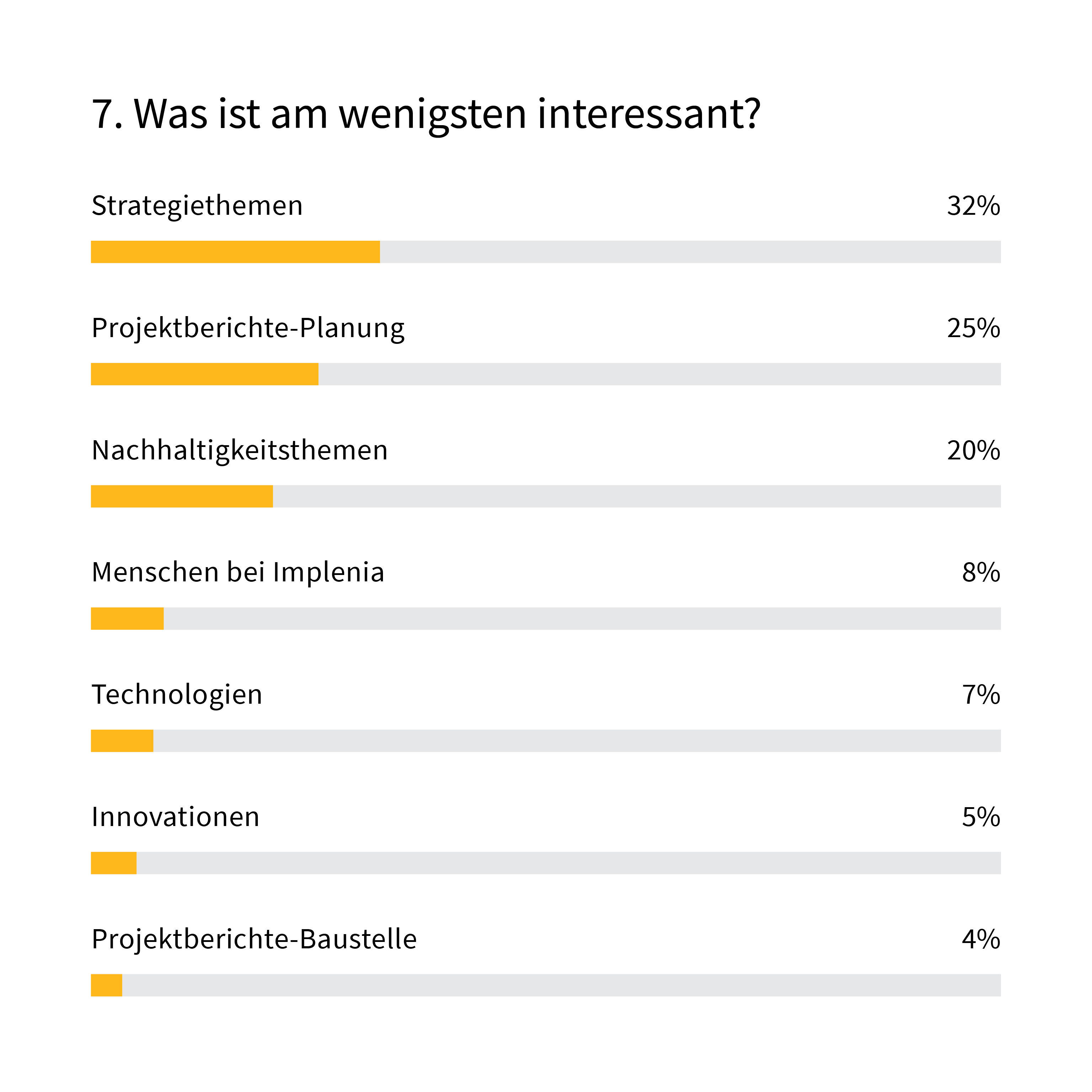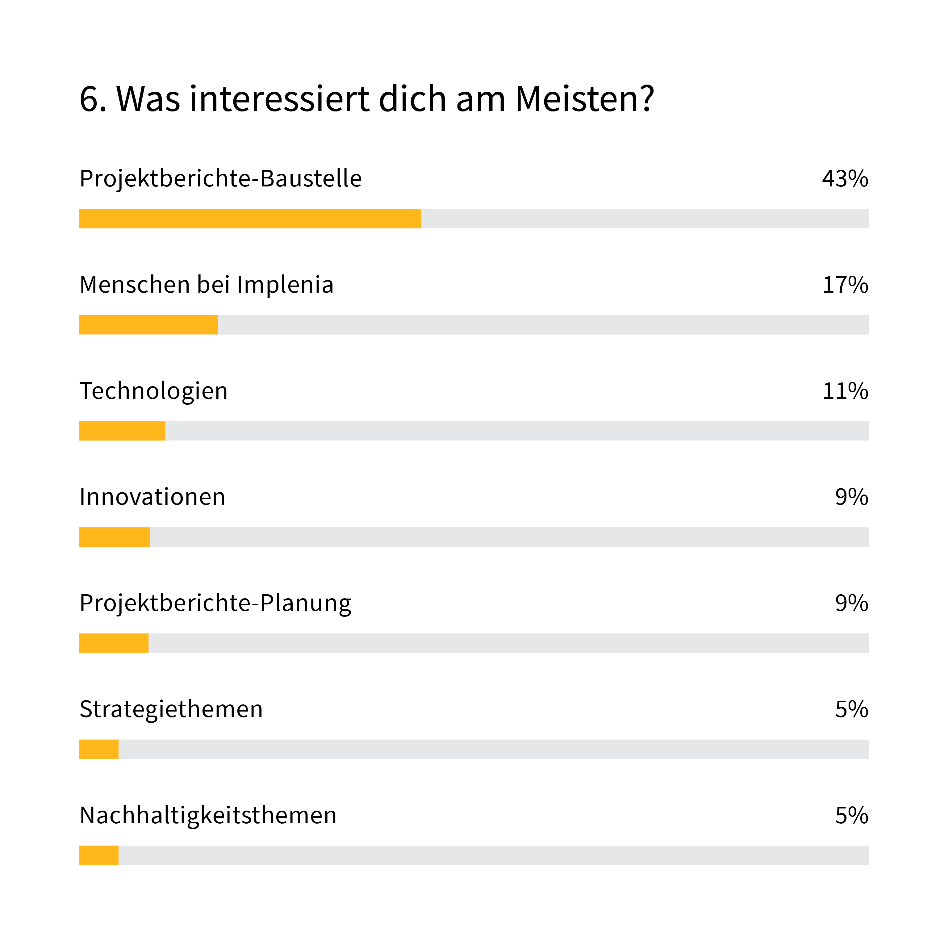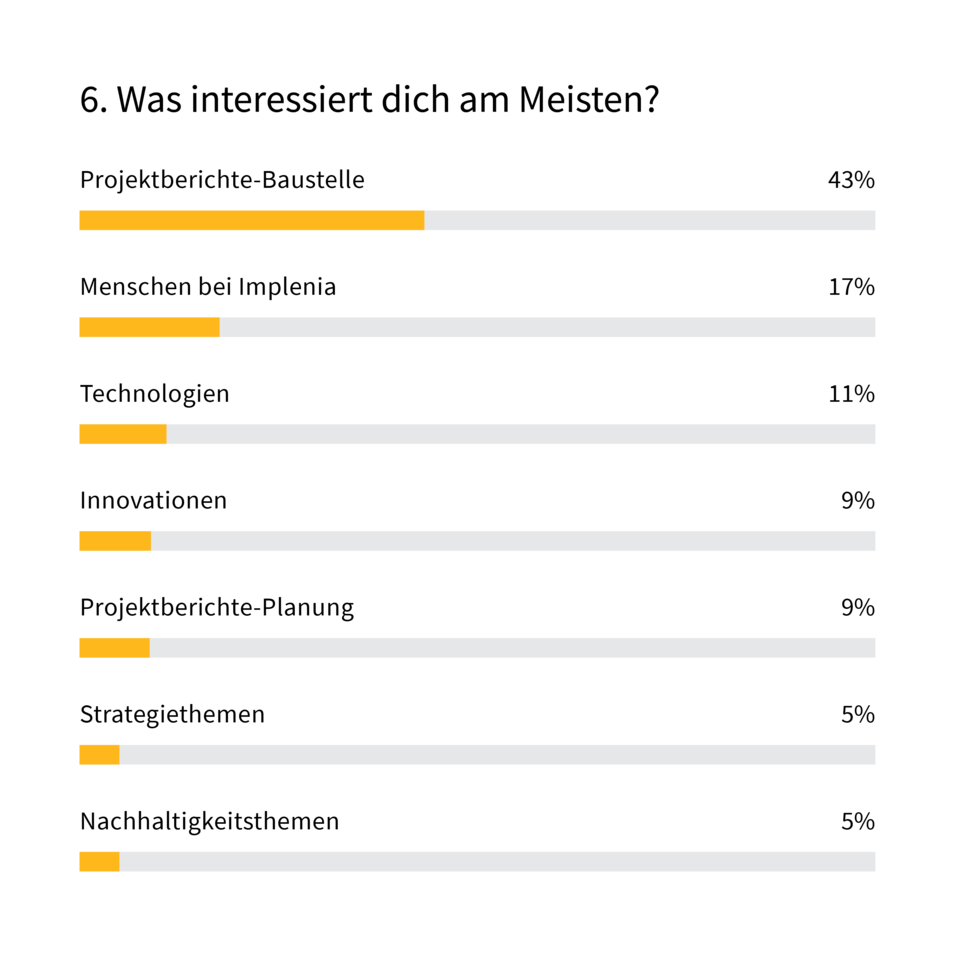 Auch bei den Inhalten gibt es klare Prioritäten. Gefragt sind Berichte aus der Praxis und über Menschen. Auch spannende neue Technologien können begeistern. Weniger interessant: Strategie- und Planungsthemen und das Thema Nachhaltigkeit.