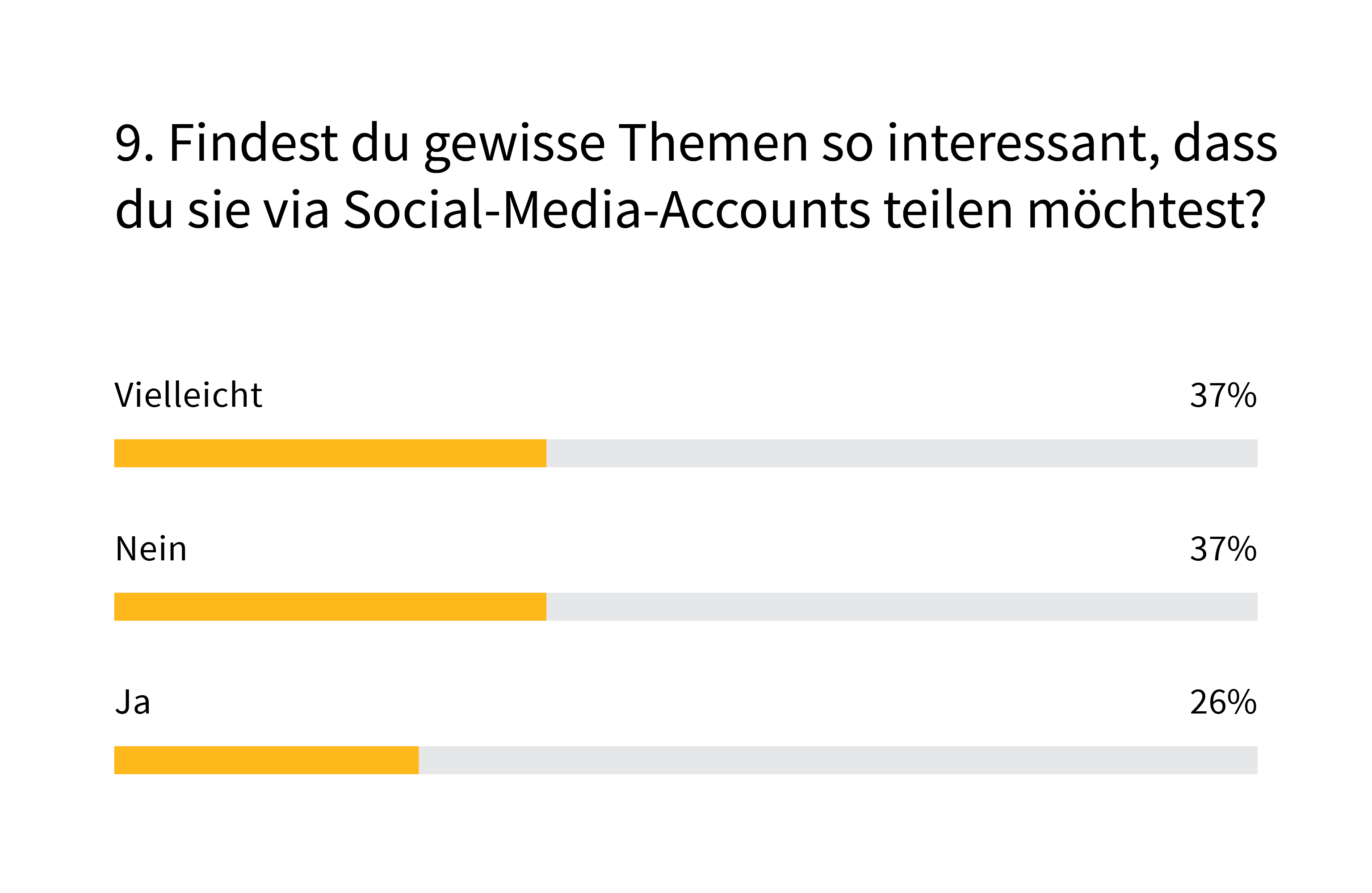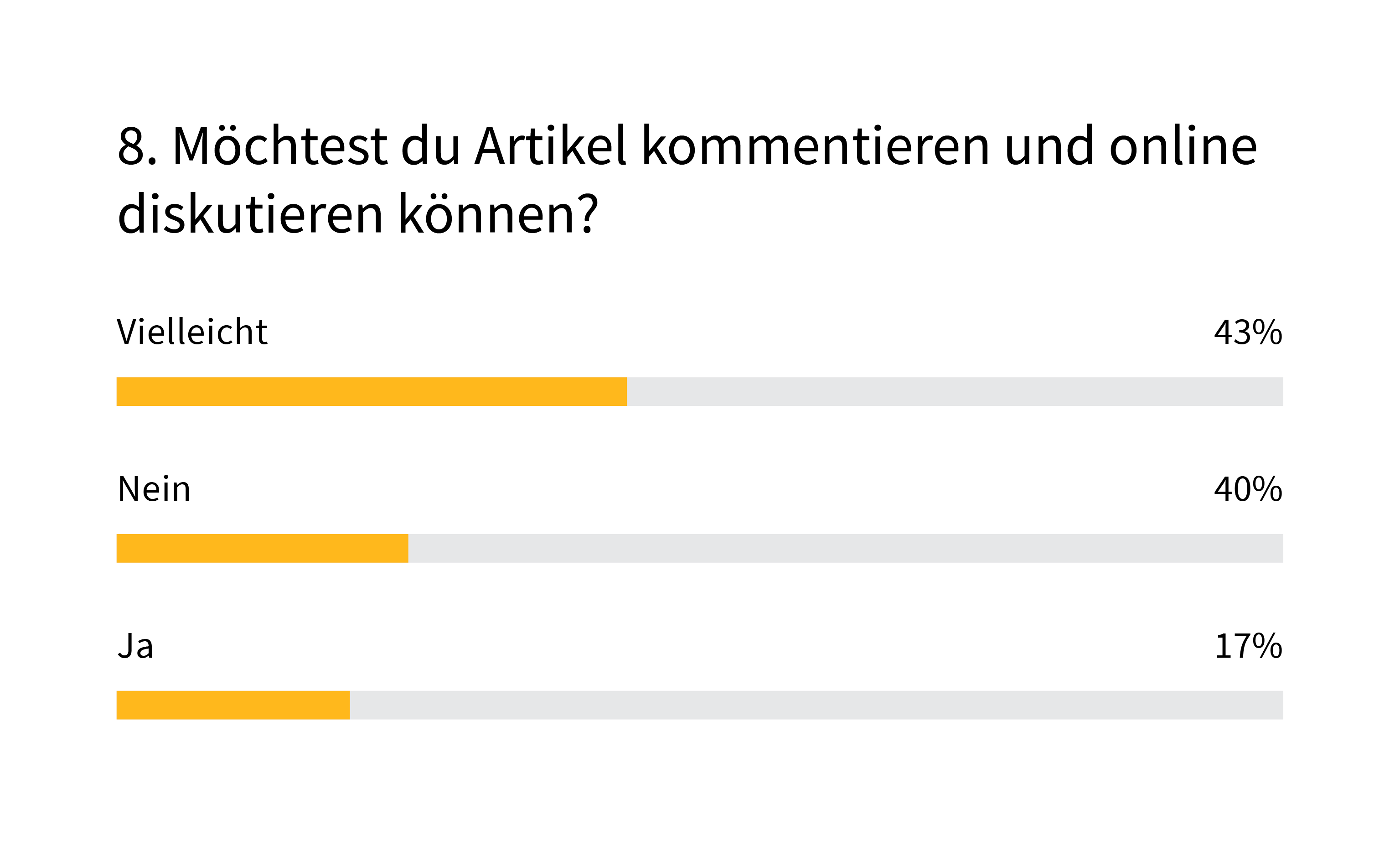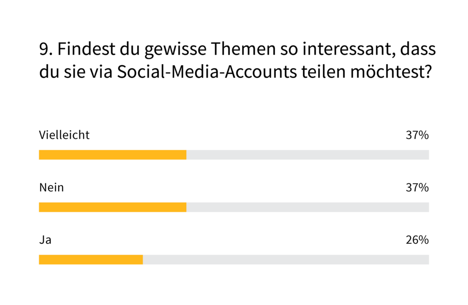 Mehr Dialog? Da seid ihr euch noch nicht so sicher. Am Ende der Umfrage wollten wir wissen, wie sehr ihr Artikel kommentieren und über soziale Kanäle teilen möchtet. Nur 17% wollen eine Kommentarfunktion, 43% vielleicht. Ganze 40% aber würden ganz darauf verzichten. Und auch der Wunsch, Inhalte via soziale Medien zu verteilen, ist unterschiedlich stark ausgeprägt: 63% sagen Ja oder Vielleicht, 74% Nein oder Vielleicht.