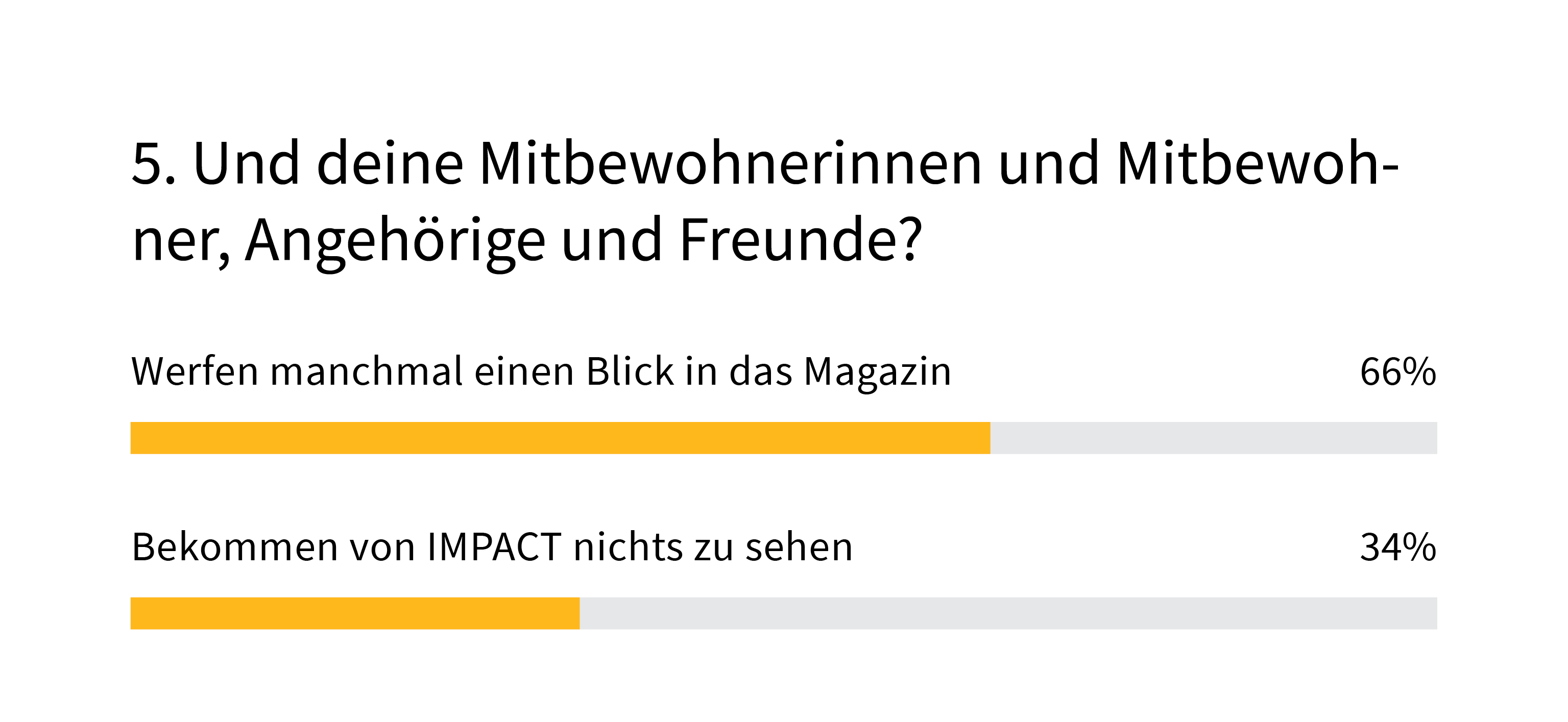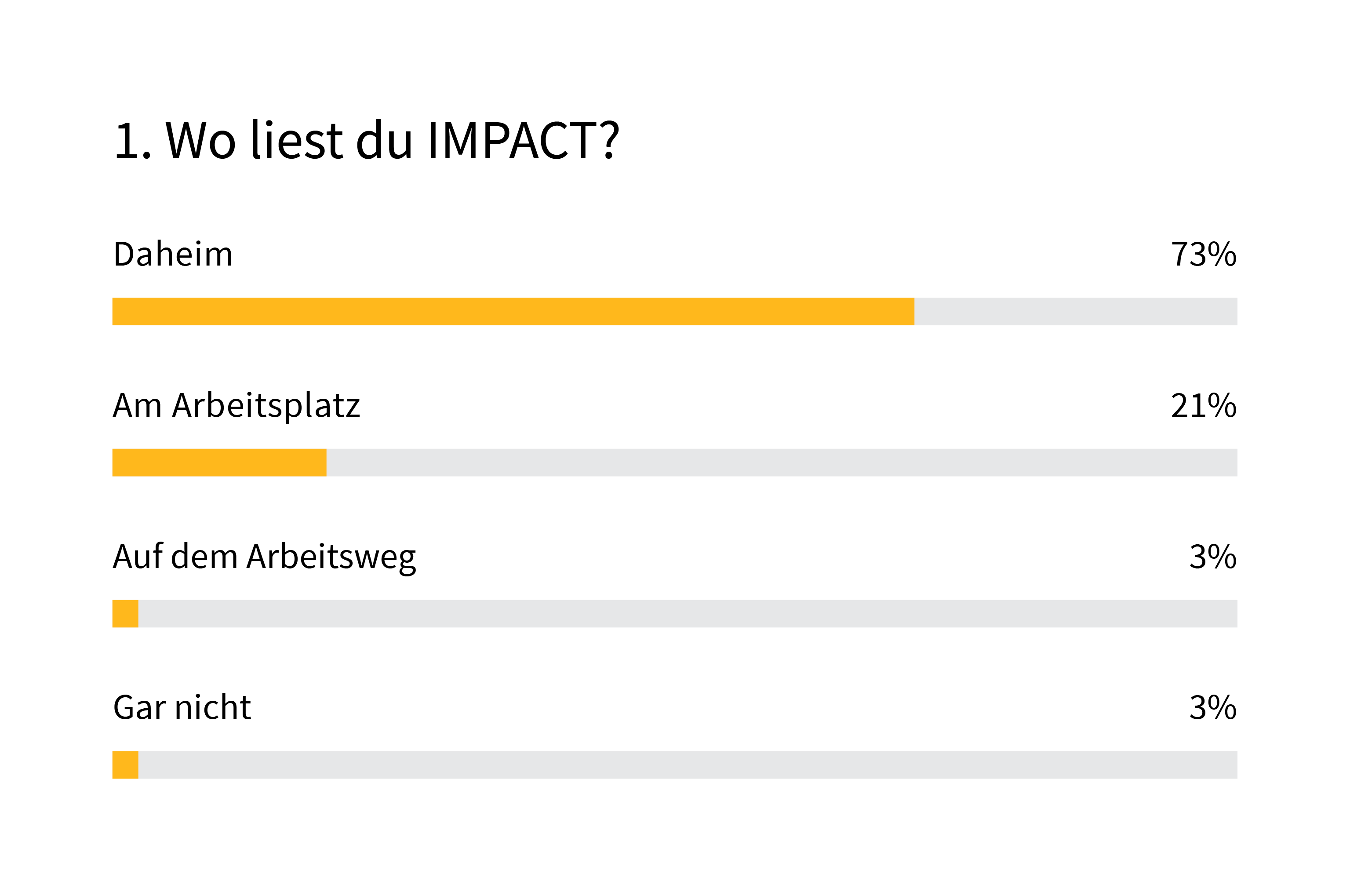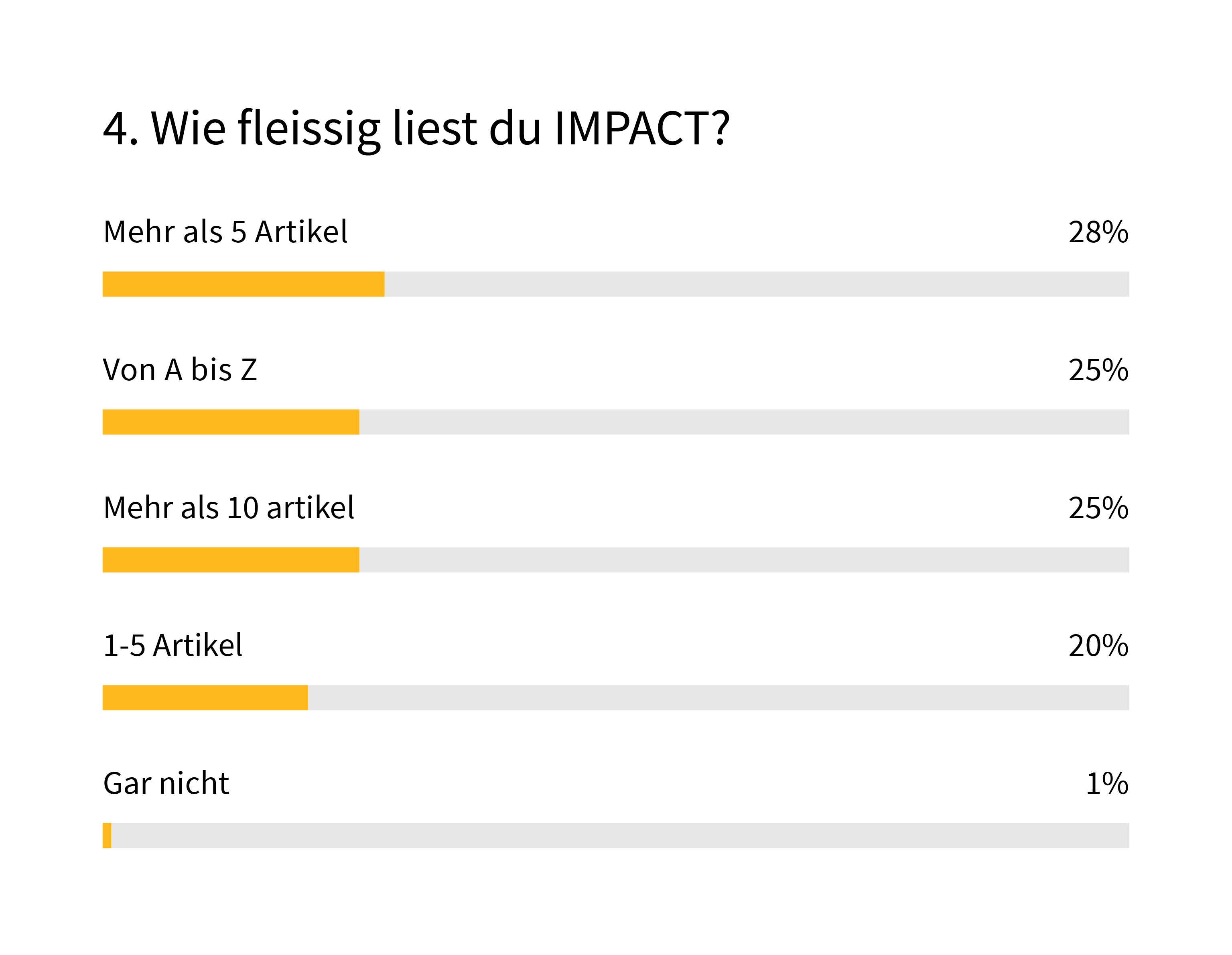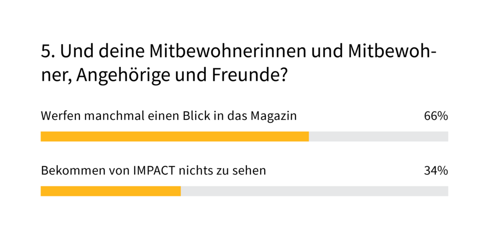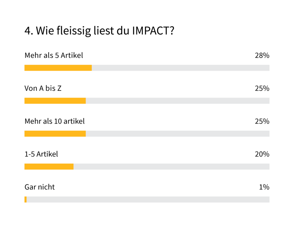 Die gute Nachricht für uns: IMPACT wird gelesen. Und zwar extrem fleissig: 78% geben an, dass sie mehr als fünf Artikel pro Ausgabe lesen; 25% studieren das Magazin sogar von A-Z. Danke für euer Vertrauen! Gleichzeitig werfen bei 66% von euch Familienangehörige und Mitbewohnerinnen ebenfalls einen Blick in das Heft und gewinnen so einen Eindruck davon, was euer Arbeitgeber so macht.