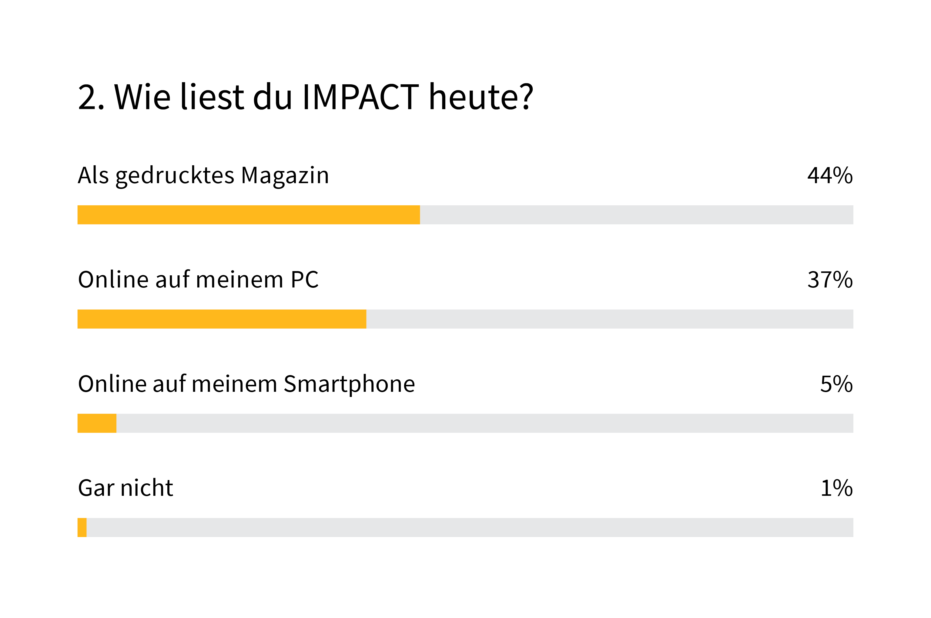 Gedruckt oder online? Hier sind die Prioritäten nicht so klar. Heute lesen 44% von euch IMPACT in der gedruckten Version. 37% konsumieren die Inhalte online auf dem PC. Ähnlich sieht es mit euren Wünschen für die Zukunft aus: Während die meisten von euch die Kombination von Druck- und Online-Version schätzen, könnten immerhin 44% ganz auf die Druckversion verzichten; 15% dagegen bräuchten keine Online-Version.